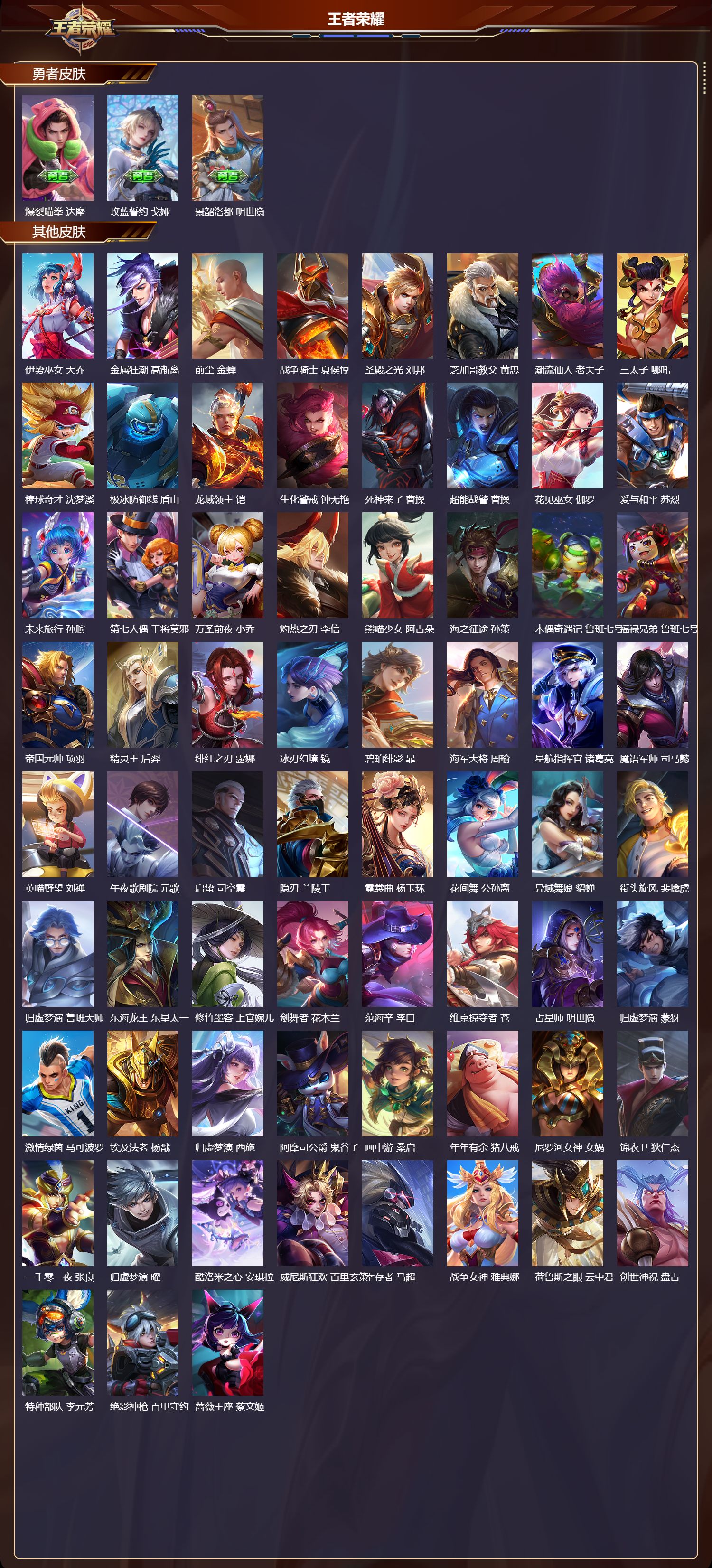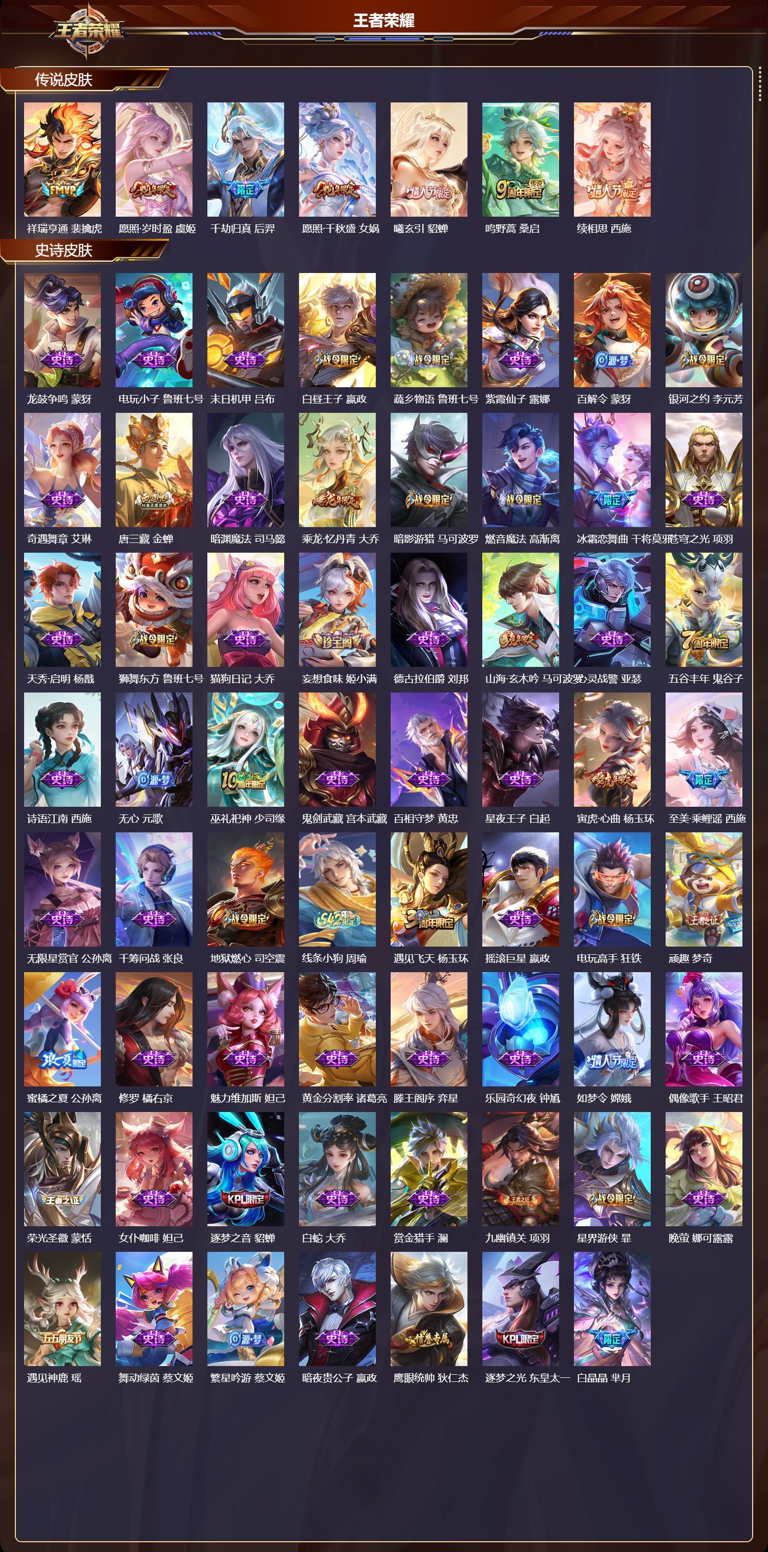 苹果QQ/至尊星耀/501皮肤/126英雄/5典藏/0珍品无双/3无双/5珍品传说/64传说/158史诗/9稀有英雄【5 珍品传说】酷洛米之心 安琪拉,朽木白哉 暃,黑崎一护 宫本武藏,怪盗基德 马可波罗,器灵·落星盏 嫦娥,【5 典藏皮肤】鸣剑·曳影 李白,全息碎影 孙悟空,幻阙歌 貂蝉,无限飓风号 夏侯惇,九霄神辉 花木兰,【3 无双皮肤】碎月剑心 李白,时之魔女 小乔,器灵·螭龙剑 曜,【6