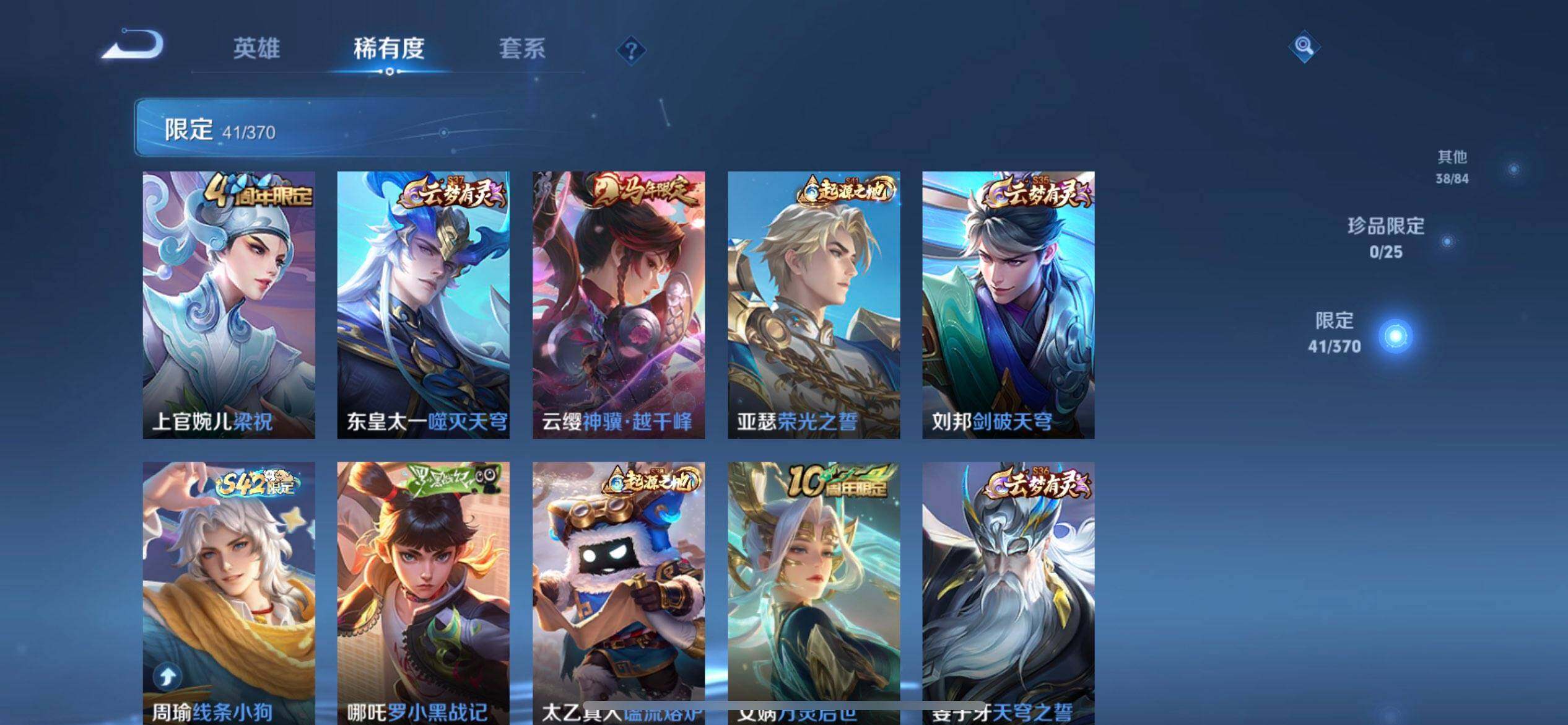 【限定皮肤】:姜子牙天穹之誓,狄仁杰阴阳师,高渐离死亡摇滚,高渐离玩趣恶龙,项羽海滩派对,李元芳云中旅人,雅典娜黎明之约,百里玄策原初追逐者,梦