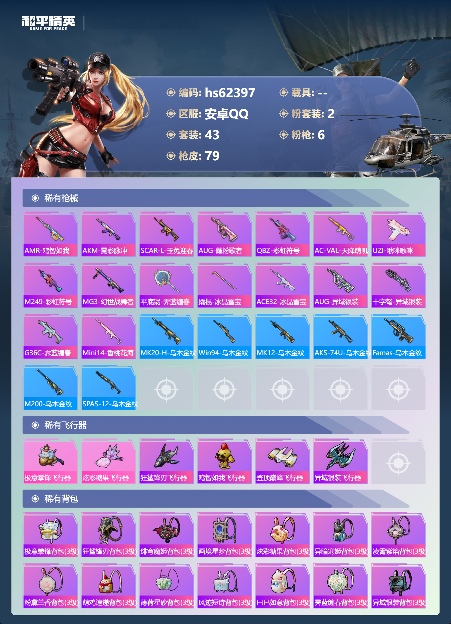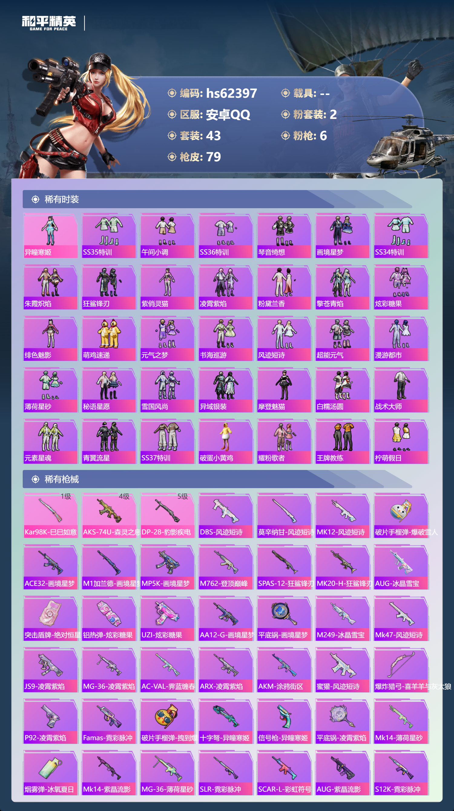 安卓手Q-0王牌印记-2粉装-6特效枪-22246热力值-43套