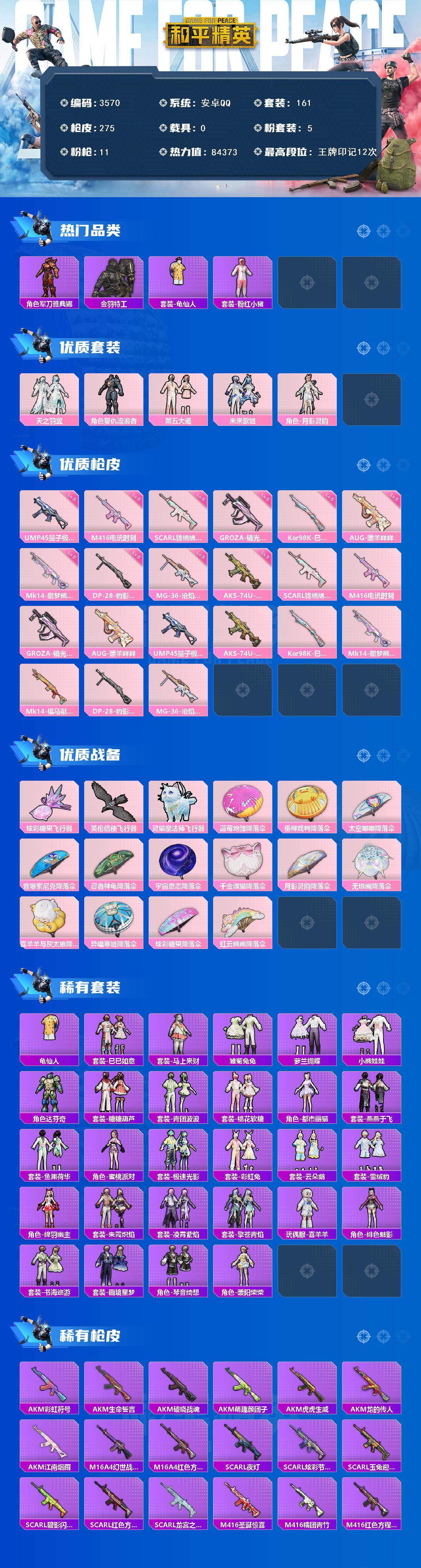 161套装/枪械11/装备345/战备178/王牌印记12/热力值84373/五级SCAR-L-锦绣绵绵/五级M416-电玩时刻/五级GROZA-镜光银凌/五级AUG-暖羊咩咩/五级UMP45-量子极限/五级AKS-74U-森灵之息/五级Kar98K-巳巳如意/五级Mk14-甜梦熊击/五级DP-28-豹影疾电/五级MG-36-沧焰双生/军刀雅典娜/金羽特工/套装-龟仙人/套装-粉红小猪/天之羽