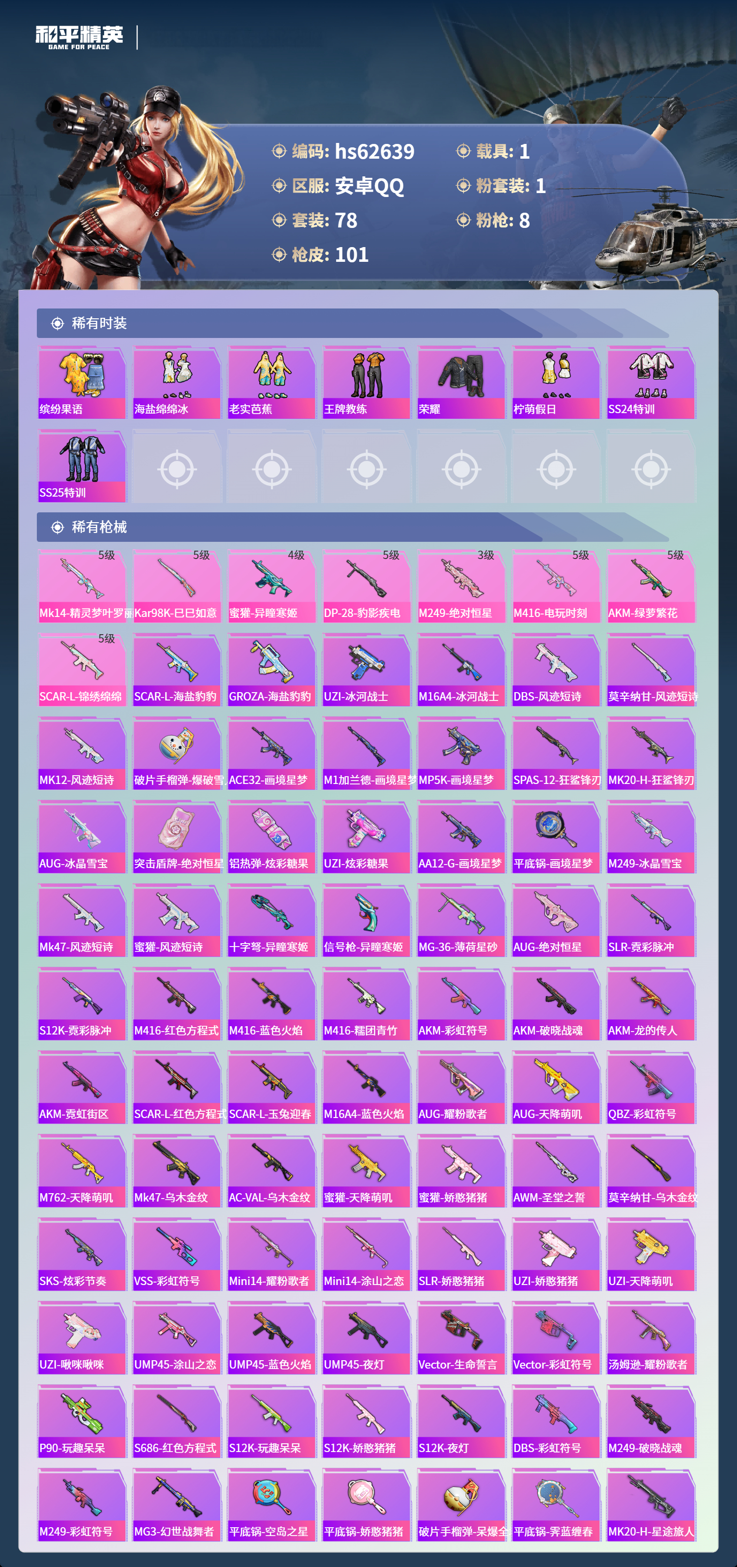 3王牌印记-1粉装-8特效枪-1载具-32294热力值