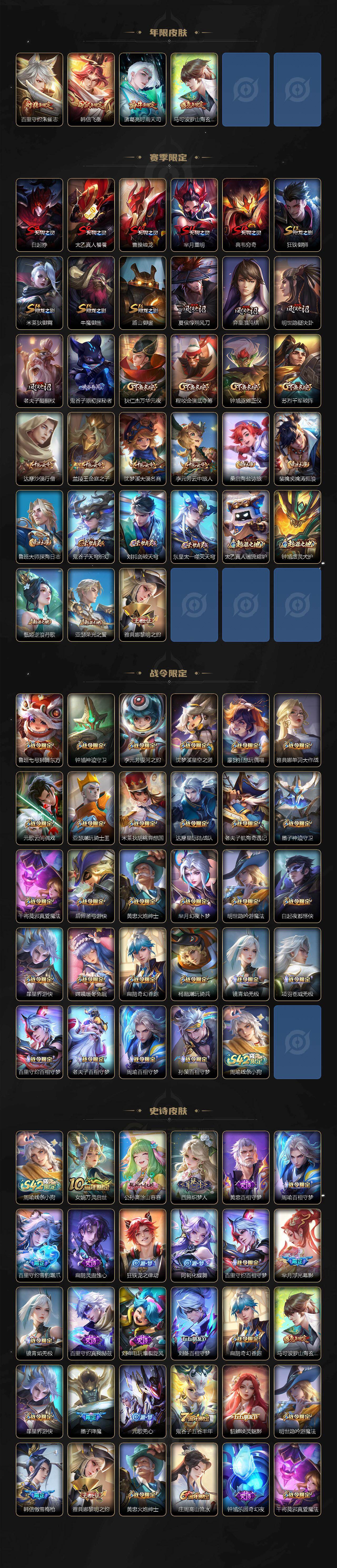贵族等级8/荣耀典藏数量2/传说皮肤数量9/史诗皮肤数量83/皮肤数量308/英雄数量128/段位至尊星耀/孙权全皮/百里守约全皮/空空儿全皮/影全皮/全息碎影 孙悟空/鸣剑·曳影 李白/朵莉亚神骥鸣幻洲/神树通天 后羿/鸣野蒿 桑启/灼幽烈阳 东皇太一/碎云 百里守约/时雨天司 诸葛亮/启明星使 虞姬/黄金白羊座 张良/末日机甲 孙尚香/狰 白起/阴阳师 狄仁杰/皇家上将 赵云/神迹守卫 墨