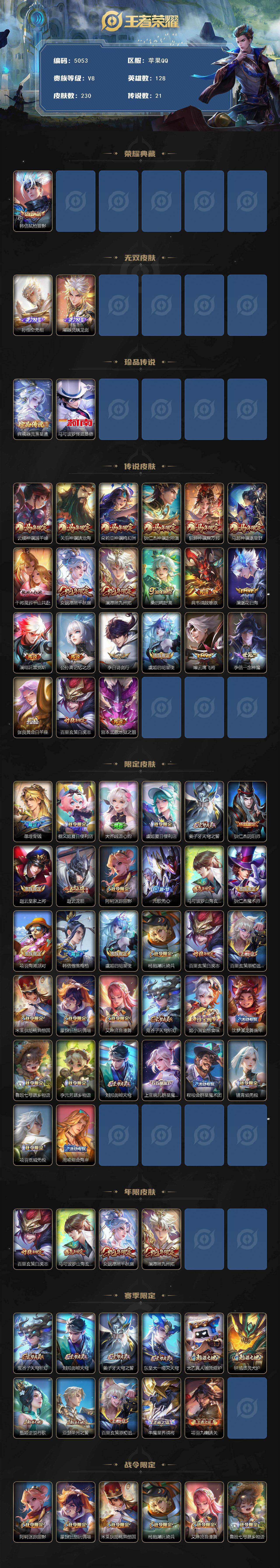贵族等级8/荣耀典藏数量1/传说皮肤数量21/史诗皮肤数量64/皮肤数量230/英雄数量128/段位最强王者/孙权全皮/敖隐全皮/澜全皮/影全皮/弑枪猎影 韩信/孙悟空无相/器灵·螭龙剑 曜/器灵·落星盏 嫦娥/怪盗基德 马可波罗/云缨神骥越千峰/关羽神骥镇沧海/朵莉亚神骥鸣幻洲/狄仁杰神骥赴朔漠/貂蝉神骥聚万邦/马超神骥逐星野/千山共赴 干将莫邪/愿照·千秋盛 女娲/愿照·九州拓 澜/鸣野蒿