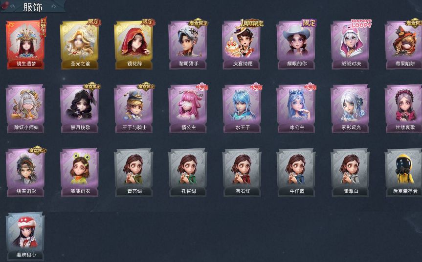 ZR775,红皮:1,金皮:2,紫皮:15,道具皮:46,服装:巫铃儿-镜生遗梦,薇薇安-圣光之谕,巫铃儿-镜花辞,艾伦-黎明猎手,阿念-庆宴绮愿,爱丽丝-耀眼的你,艾伦-绒绒对决,莉莉-莓果陷阱,莉莉-除妖小师妹,薇薇安-黑月挽歌,阿念-王子与骑士,莉莉-情公主,艾伦-水王子,爱丽丝-冰公主,巫铃儿-素影瑶光,爱丽丝-丝缕哀歌,逍遥-绣春逍影,小黄-呱呱雨衣,爱丽丝-薯牌甜心,小黄-青苔绿,小黄
