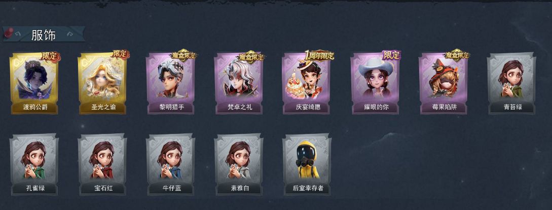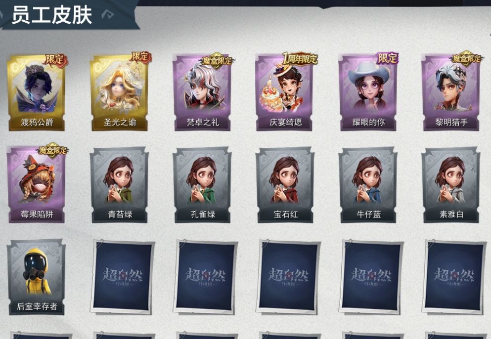 ZR776,金皮:2,紫皮:5,道具皮:19,员工:小黄、爱丽丝、零、阿念、逍遥、薇薇安、巫铃儿、莉莉、艾伦、兰、小满,服装:零-渡鸦公爵、薇薇安-圣光之谕、艾伦-黎明猎手、爱德华-梵卓之礼、阿念-庆宴绮愿、爱丽丝-耀眼的你、莉莉-莓果陷阱、小黄-青苔绿、小黄-孔雀绿、小黄-宝石红、小黄-牛仔蓝、小黄-素雅白、小黄-后室幸存者,道具皮肤:短管猎枪-赞萌露比水枪、铲子-赞萌波板糖、铲子-撒拉弗的祷告