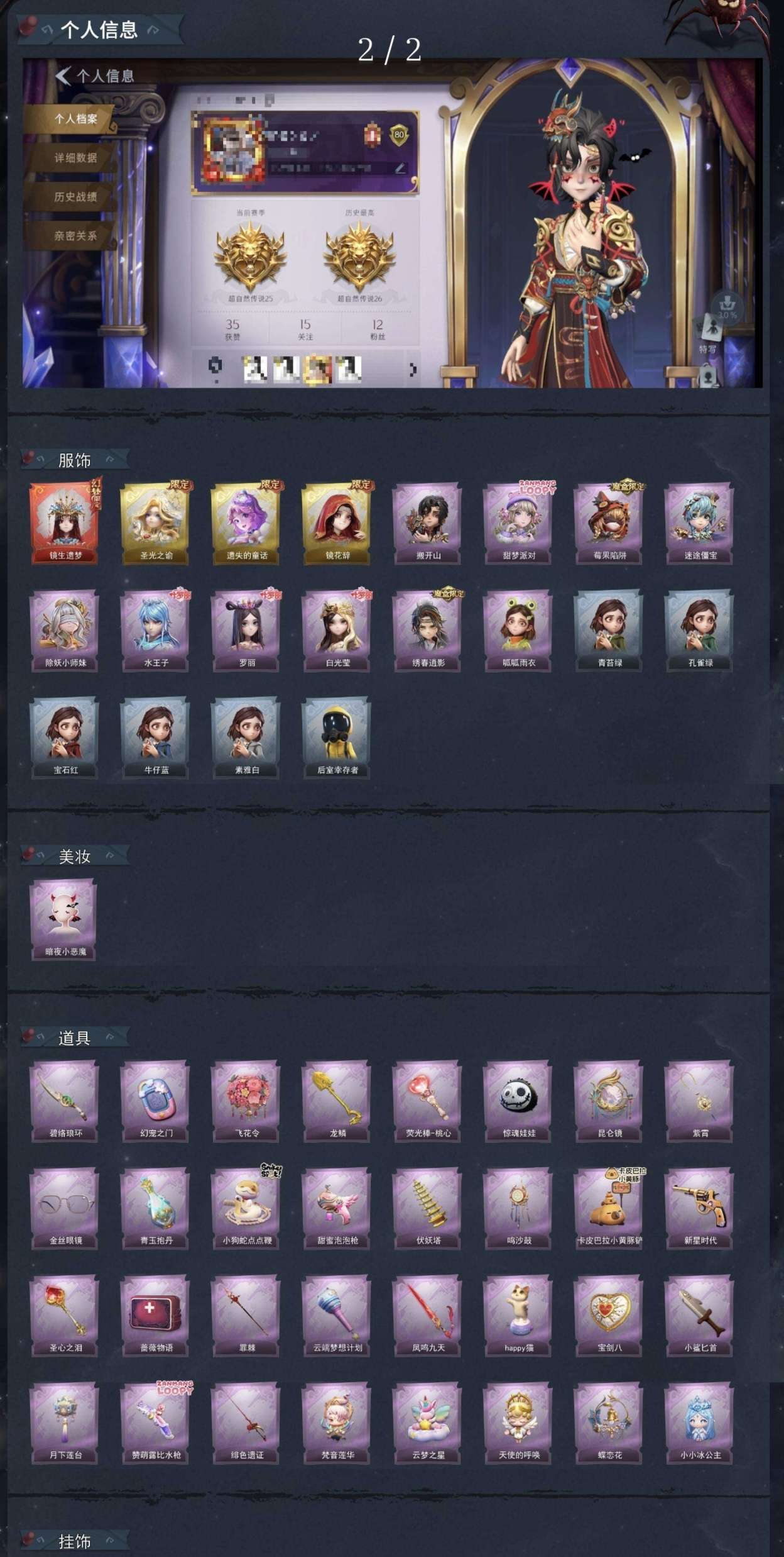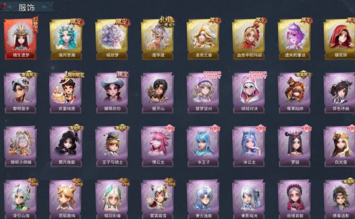 ZR777,红皮:1,金皮:7,紫皮:25,道具皮:67,服装:巫铃儿-镜生遗梦、薇薇安-海月息潮、莉莉-瑶台梦、