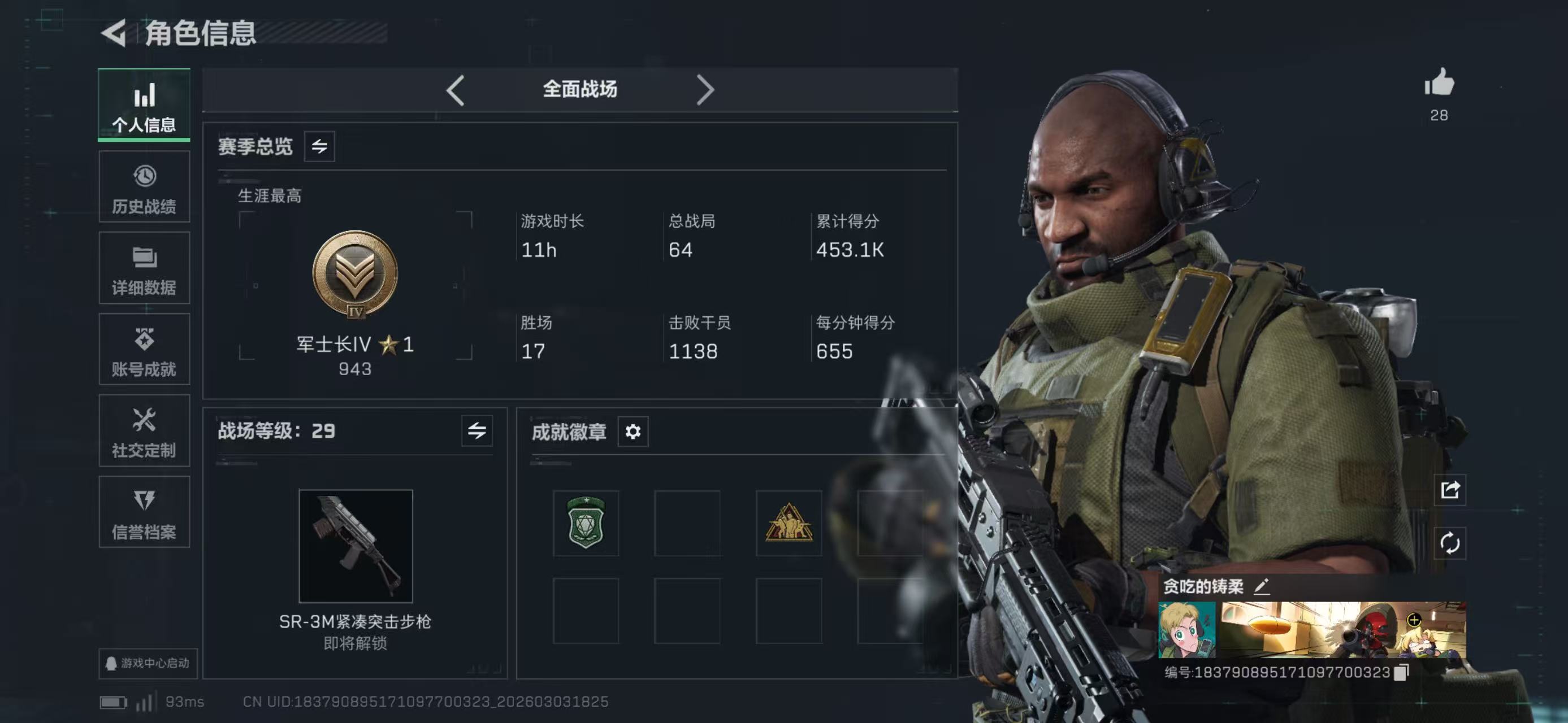 hssjz2250 总资产248.53M,哈夫币 .91K,战场等级:29 上等兵,行动等级:60 铂金,角色皮肤3,枪皮数量53【特战干员外观】乌鲁鲁-荒原猎手,骇爪-维什戴尔,红狼-电锯惊魂,【近战】近战-处刑者,近战-暗星,近战-黑鹰,【典藏外观】SKS射手步枪-蝴蝶,SG552突击步枪-彩墨涂鸦,K437突击步枪-斑马,SKS射手步枪-彩墨涂鸦,G17-斑马,G18-彩墨
