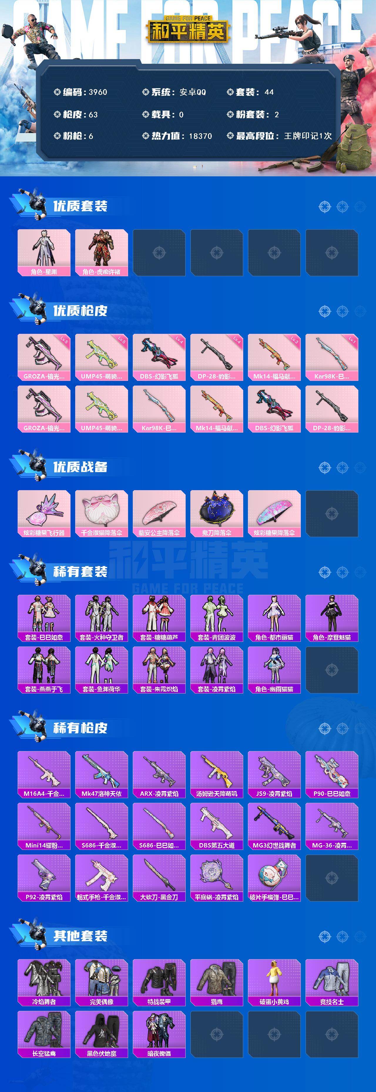 粉装2/粉枪6/珍稀飞行器/套装44/枪皮63/热力值18370/历史最高段位:王牌印记1次/Lv:42/五级GROZA-镜光银凌/五级UMP45-萌骑冒险/Kar98K-巳巳如意/三级Mk14-福马献瑞/四级DBS-幻影飞狐/四级DP-28-豹影疾电/角色-星渊/角色-虎痴许褚/GROZA-镜光银凌/UMP45-萌骑冒险/Mk14-福马献瑞/DBS-幻影飞狐/DP-28-豹影疾电
