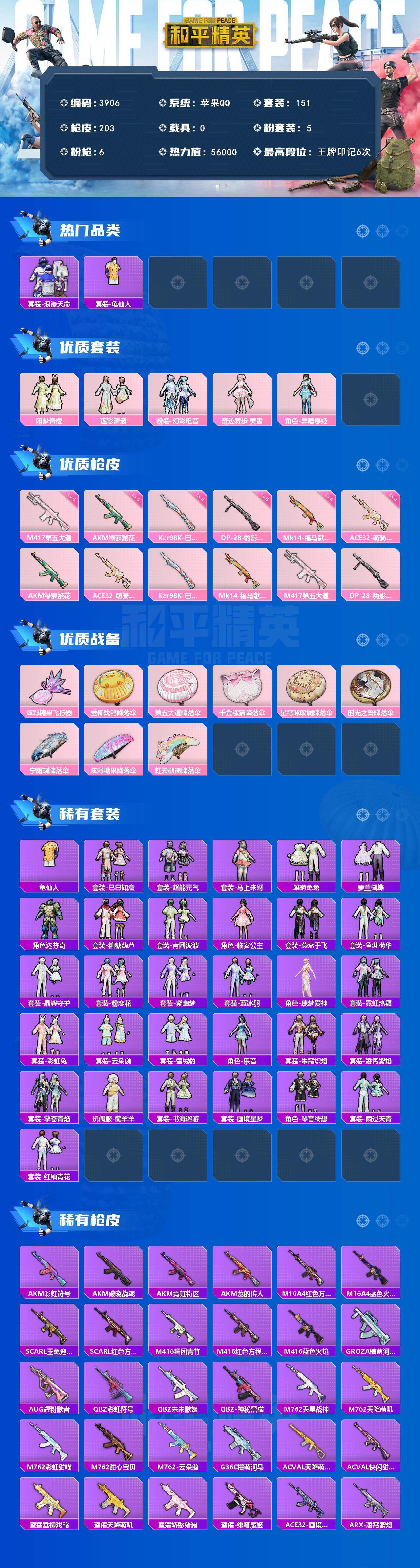 151套装/枪械6/装备259/战备160/王牌印记6/热力值56000/五级AKM-绿萝繁花/三级ACE32-萌骑漫游/五级Kar98K-巳巳如意/四级Mk14-福马献瑞/六级M417-第五大道/五级DP-28-豹影疾电/套装-浪漫天命/套装-龟仙人/闲梦青缨/莲影清波/粉装-幻彩电音/角色-奇迹舞步 美雪/角色-异瞳寒姬/AKM-绿萝繁花/ACE32-萌骑漫游/Kar98K-巳巳如意/Mk