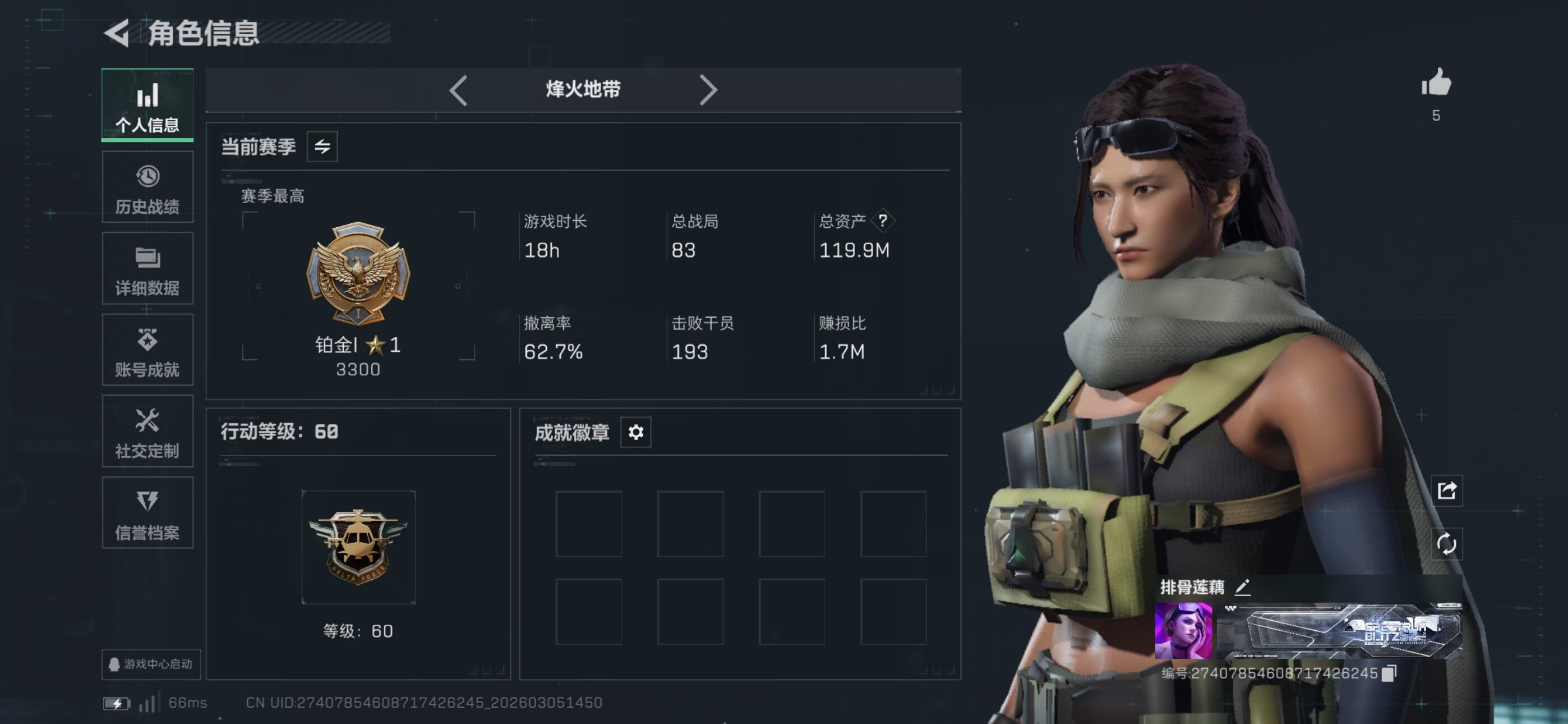 总资产119M/哈夫币4925万/传说近战数1/传说枪皮数18/战场等级36/行动等级60/安全箱等时效性道具以游戏内数据为准,详情请看图/红狼-电锯惊魂/近战-暗星/近战-信条/近战-龙牙/近战-黑鹰/M4A1突击步枪-阿米娅/AKM突击步枪-锦绣/AK-12突击步枪-特斯拉线圈/SCAR-H战斗步枪-水墨云图/SCAR-H战斗步枪-启航/CAR-15突击步枪-阿米娅/腾龙突击步枪-捞点薯条