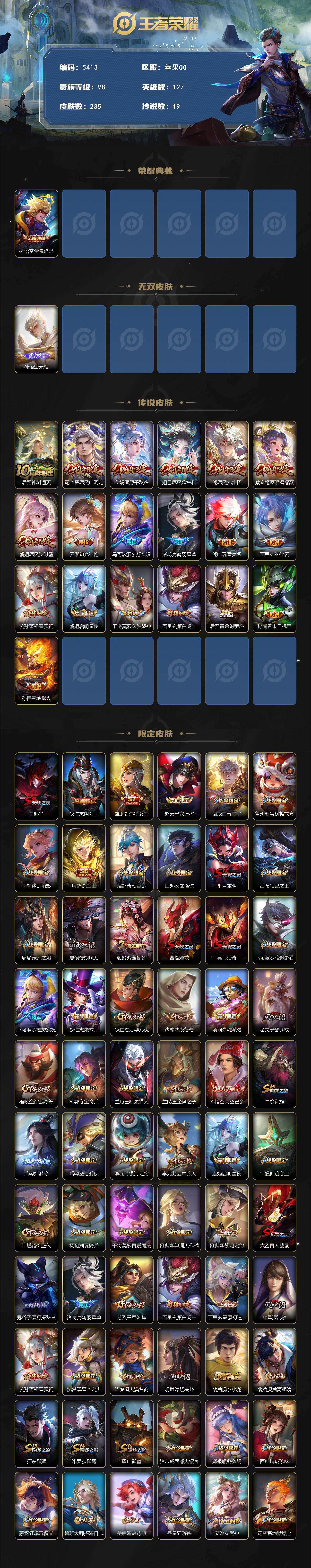 贵族等级8/荣耀典藏数量1/传说皮肤数量19/史诗皮肤数量49/皮肤数量235/英雄数量127/段位最强王者/司空震全皮/全息碎影 孙悟空/孙悟空无相/神树通天 后羿/愿照·山河定 司空震/愿照·千秋盛 女娲/愿照·众生和 妲己/愿照·九州拓 澜/愿照·福禄聚 蔡文姬/愿照·岁时盈 虞姬/幻光神枪 云缨/妄想实况 马可波罗/鹤羽星尊 诸葛亮/电玩·雷克斯 澜/碎云 百里守约/祈雪灵祝 公孙离/