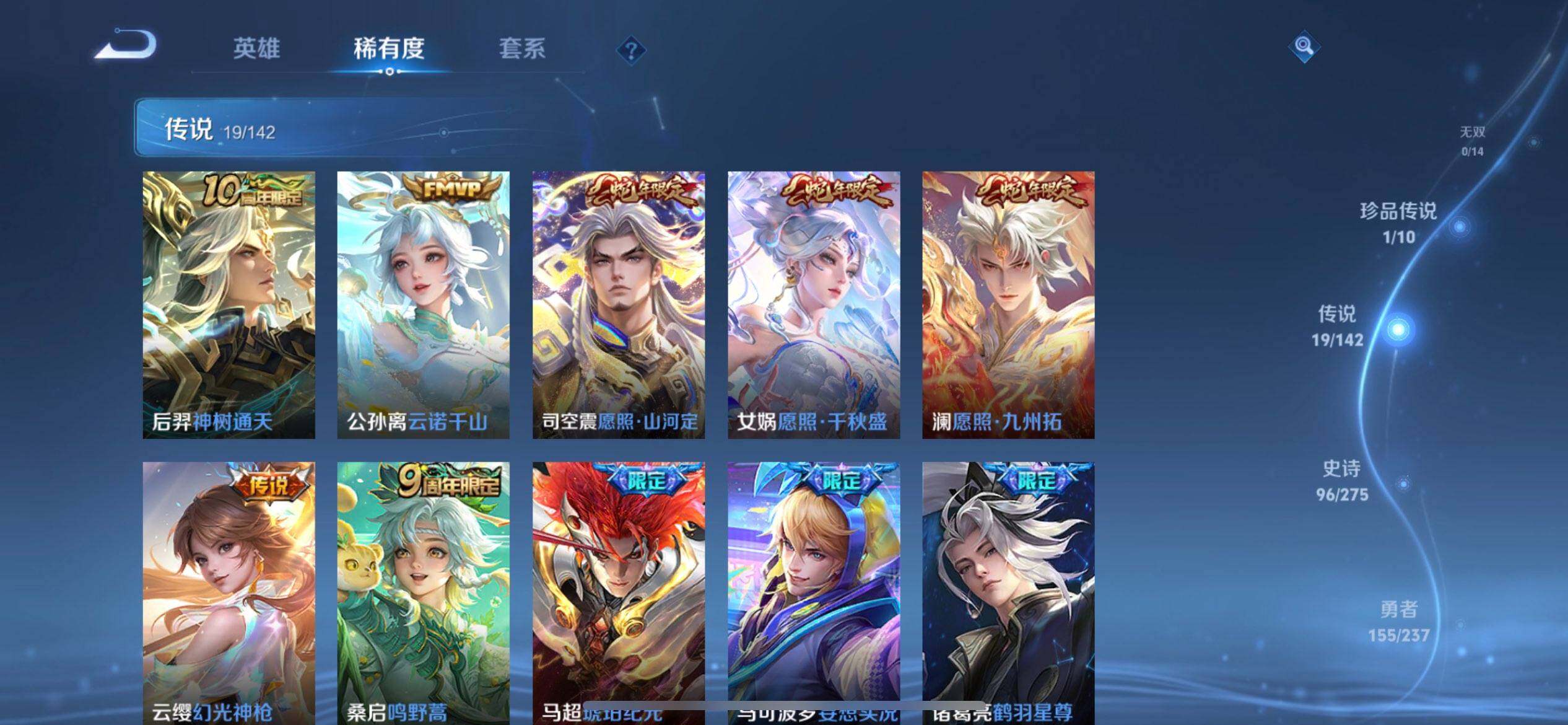 【传说皮肤】:云缨幻光神枪,嬴政玄雷天君,上官婉儿妄想奇谈,诸葛亮鹤羽星尊,马超无双飞将,镜炽阳神光,干将莫邪久胜战神,孙尚香末日机甲,狄仁杰超时空战士