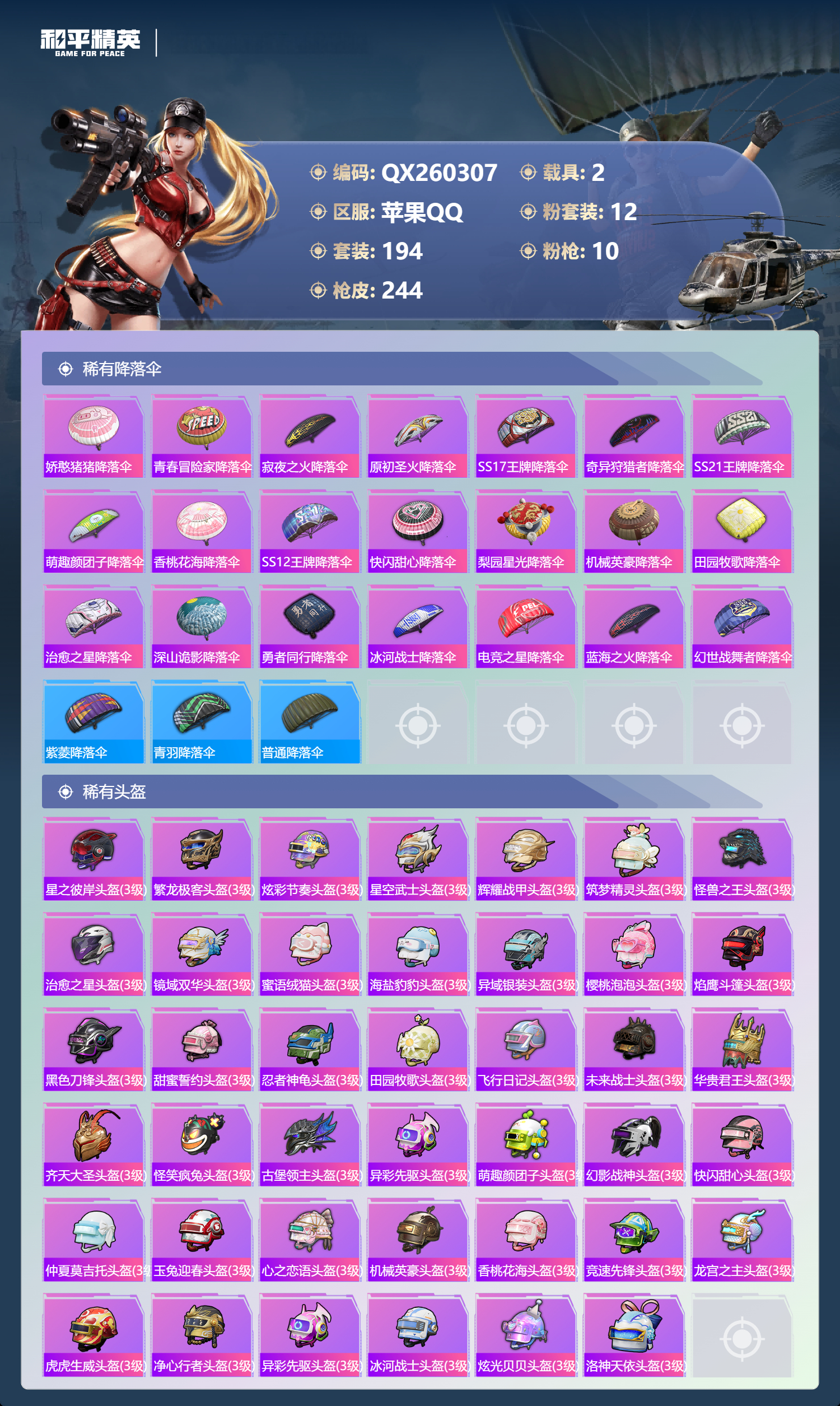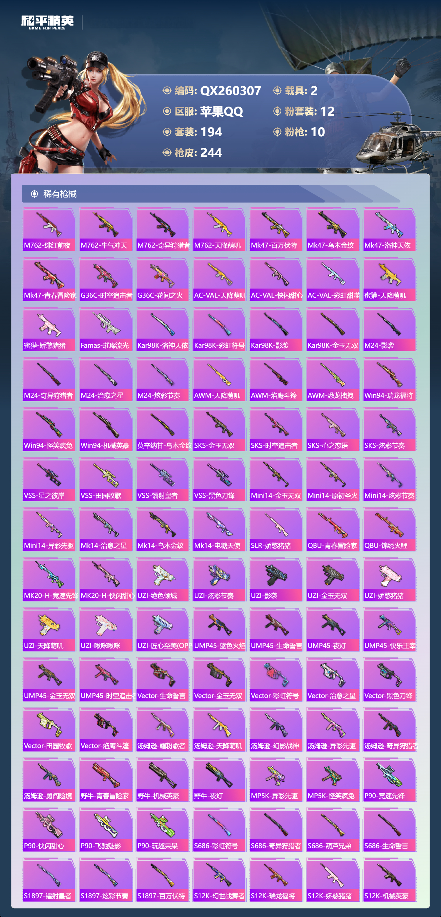 苹果手Q-14王牌印记-有战神框-12粉装-10特效枪-2载具-84755热力值