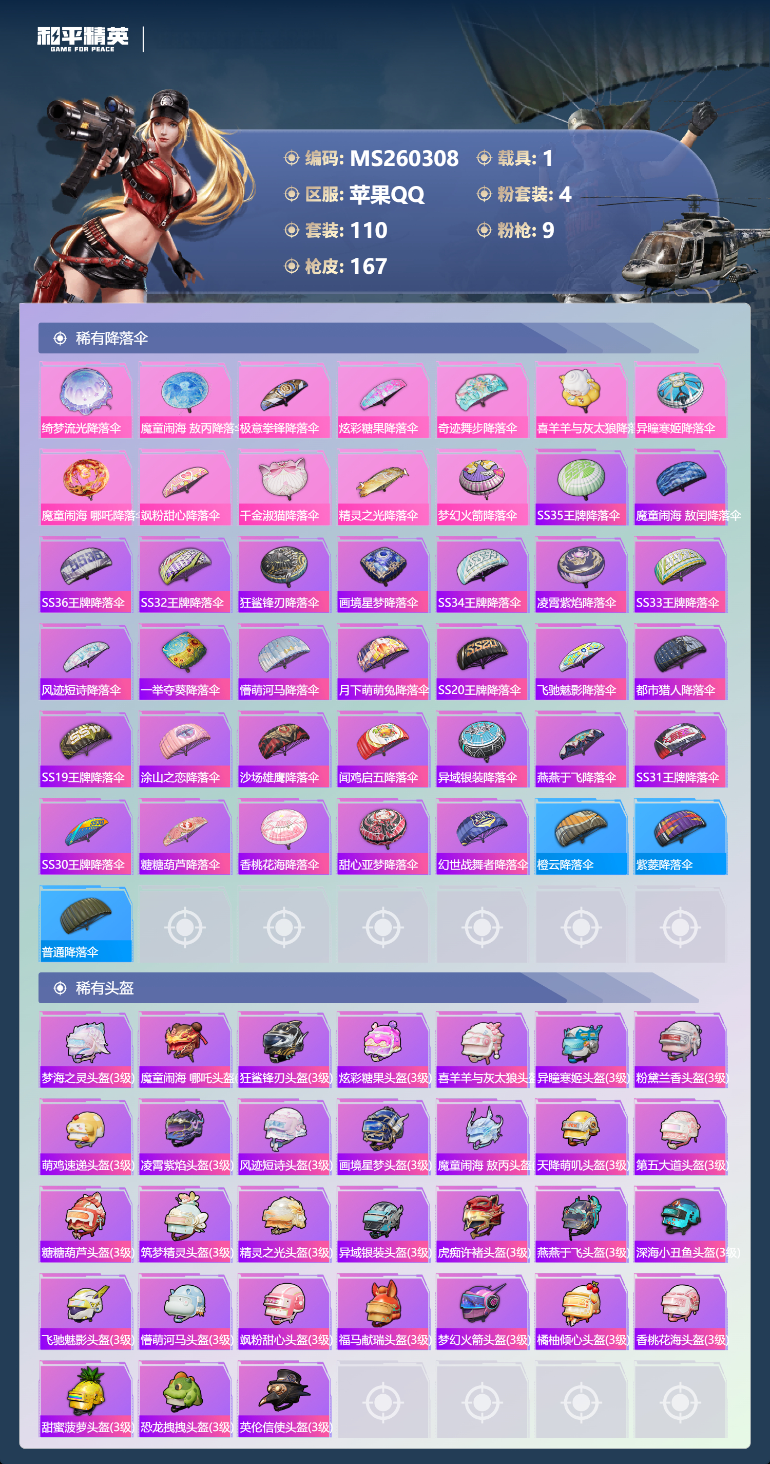 苹果手Q-11王牌印记-2红装-4粉装-9特效枪-1载具-55546热力值-11