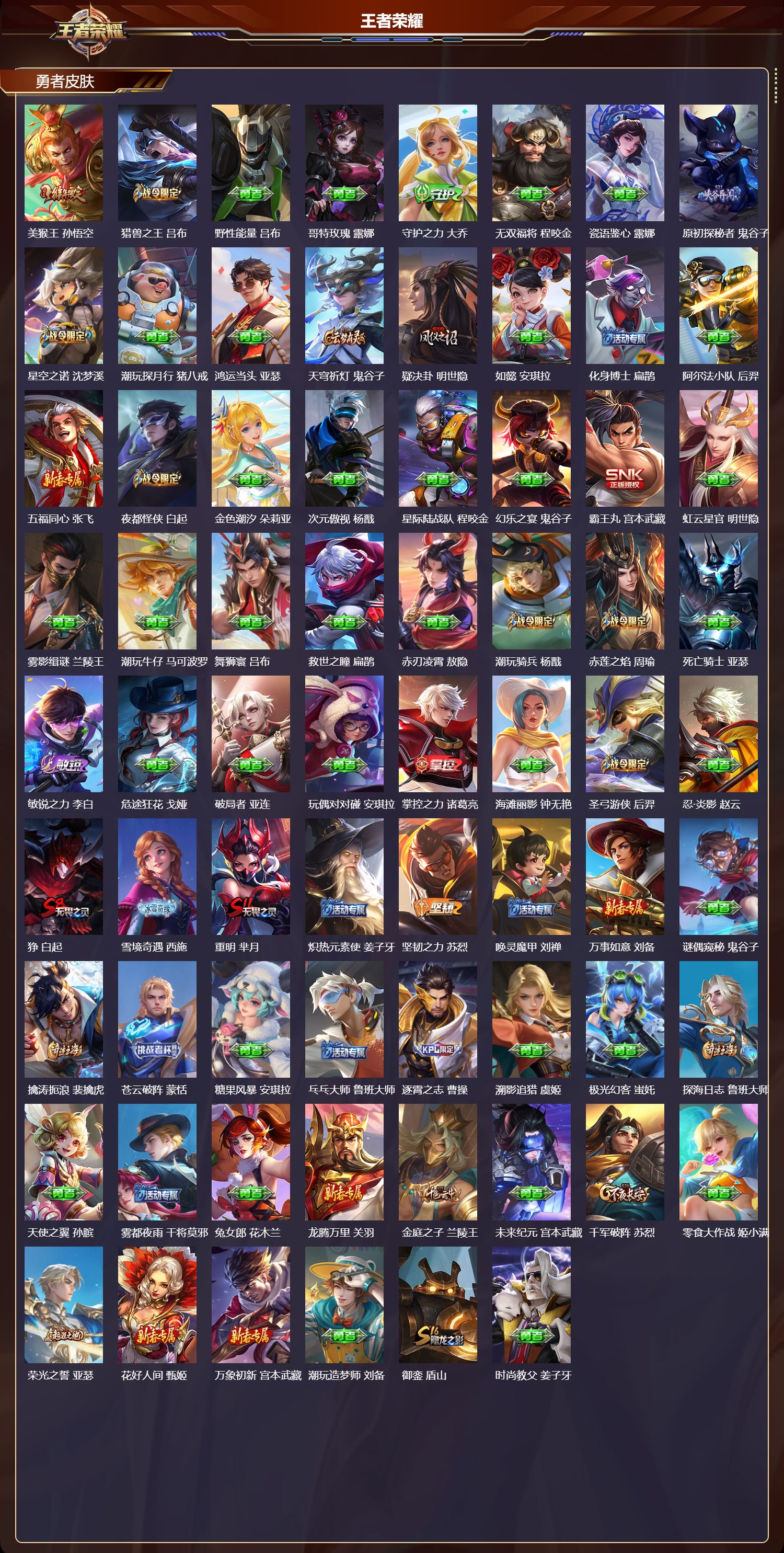 苹果QQ/永恒钻石/408皮肤/128英雄/3典藏/0珍品无双/2无双/1珍品传说/27传说/127史诗/9稀有英雄【1 珍品传说】时之奇旅 孙策,【3 典藏皮肤】九霄神辉 花木兰,赤影疾锋 关羽,最初的交响 伽罗,【2 无双皮肤】雪境奇遇 甄姬,真我赫兹 瑶,【27 传说皮肤】胖达荣荣 梦奇,启明星使 虞姬,无双飞将 马超,云鹰飞将 曜,深海之息 马可波罗,游龙清影 西施,诗剑行 李白,浮生妄