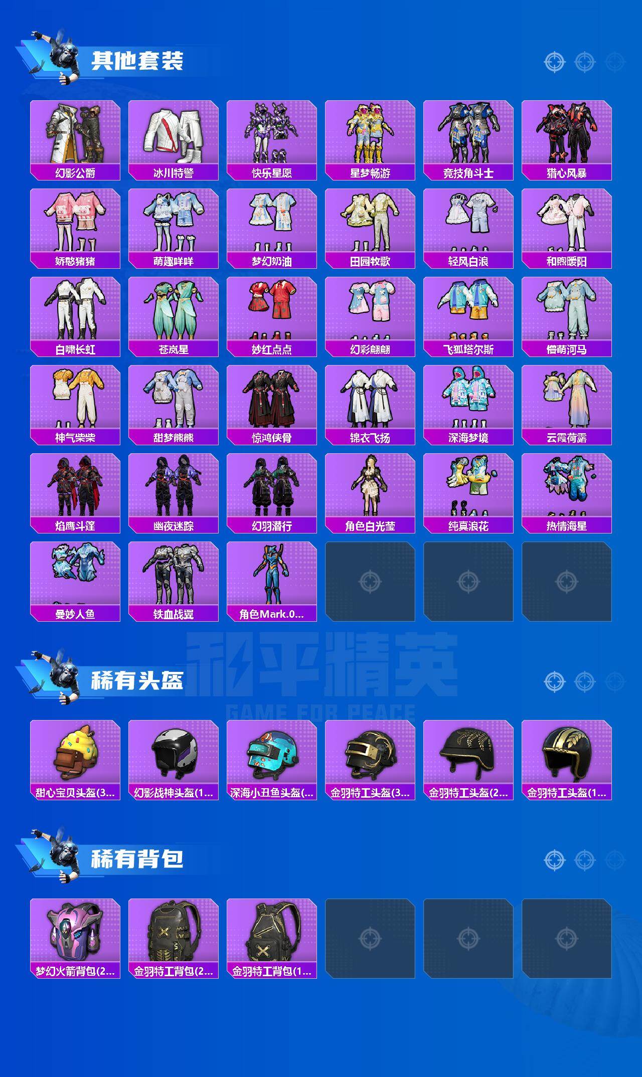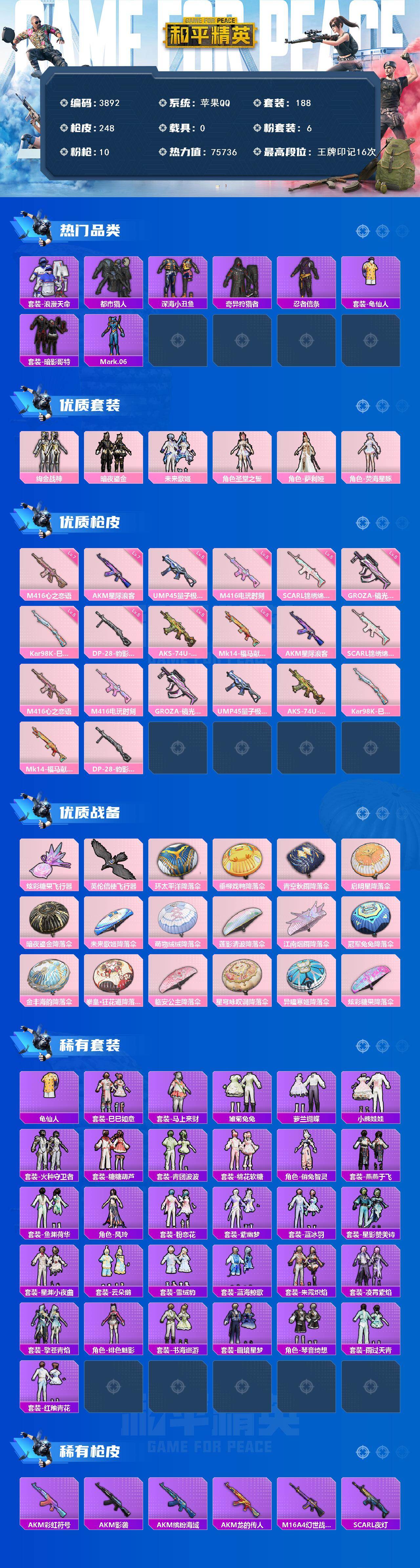 粉装6/粉枪10/珍稀飞行器,/套装188/枪皮248/热力值75736/历史最高段位:王牌印记16次/Lv:66/七级AKM-星际浪客/五级SCAR-L-锦绣绵绵/七级M416-心之恋语/五级M416-电玩时刻/五级GROZA-镜光银凌/五级UMP45-量子极限/五级AKS-74U-森灵之息/五级Kar98K-巳巳如意/五级Mk14-福马献瑞/五级DP-28-豹影疾电