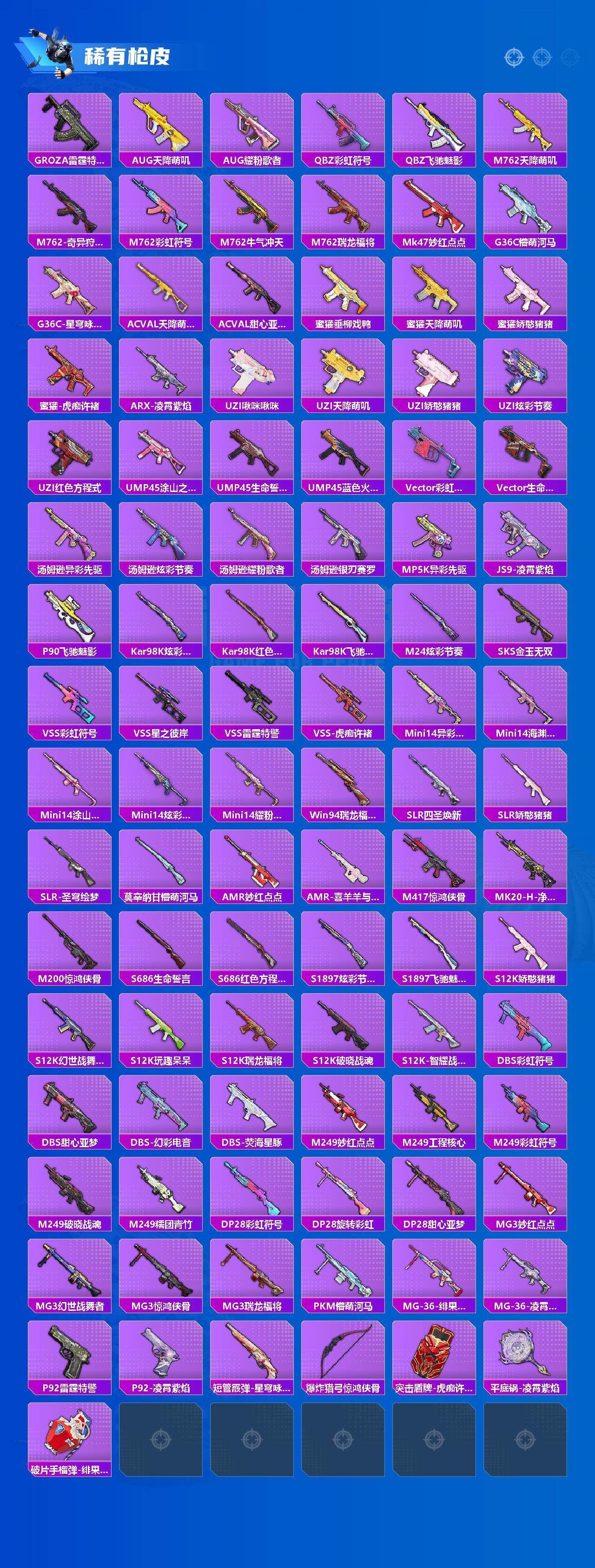 粉装7/粉枪6/载具2/珍稀飞行器,,/套装195/枪皮227/热力值74369/历史最高段位:王牌印记8次/Lv:62/七级AUG-星之彼岸/四级UMP45-萌骑冒险/五级Kar98K-巳巳如意/一级Mk14-福马献瑞/六级M249-霁蓝缠春/五级DP-28-豹影疾电/粉装-缤纷油彩/套装-龟仙人/套装-粉红小猪/角色-8号机/角色-Mark.06/缤纷油