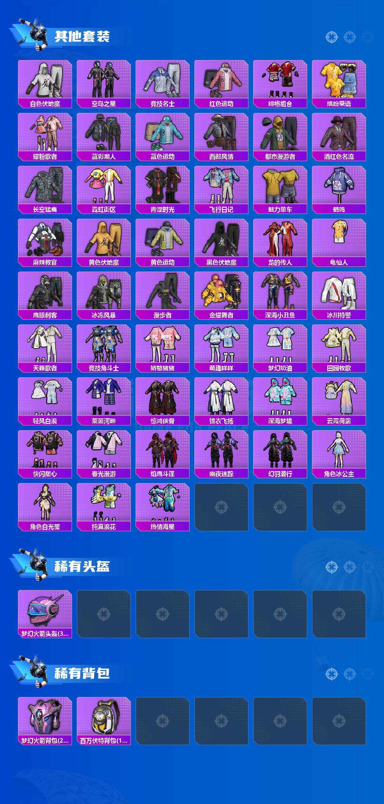 粉装3/粉枪15/珍稀飞行器,/套装128/枪皮180/热力值56522/历史最高段位:王牌印记8次/Lv:57/五级AKM-绿萝繁花/五级SCAR-L-锦绣绵绵/五级M416-电玩时刻/五级GROZA-镜光银凌/四级AUG-星之彼岸/五级M762-青锋波束/五级ACE32-萌骑漫游/五级UMP45-量子极限/五级AKS-74U-森灵之息/五级Kar98K-巳巳如意/五
