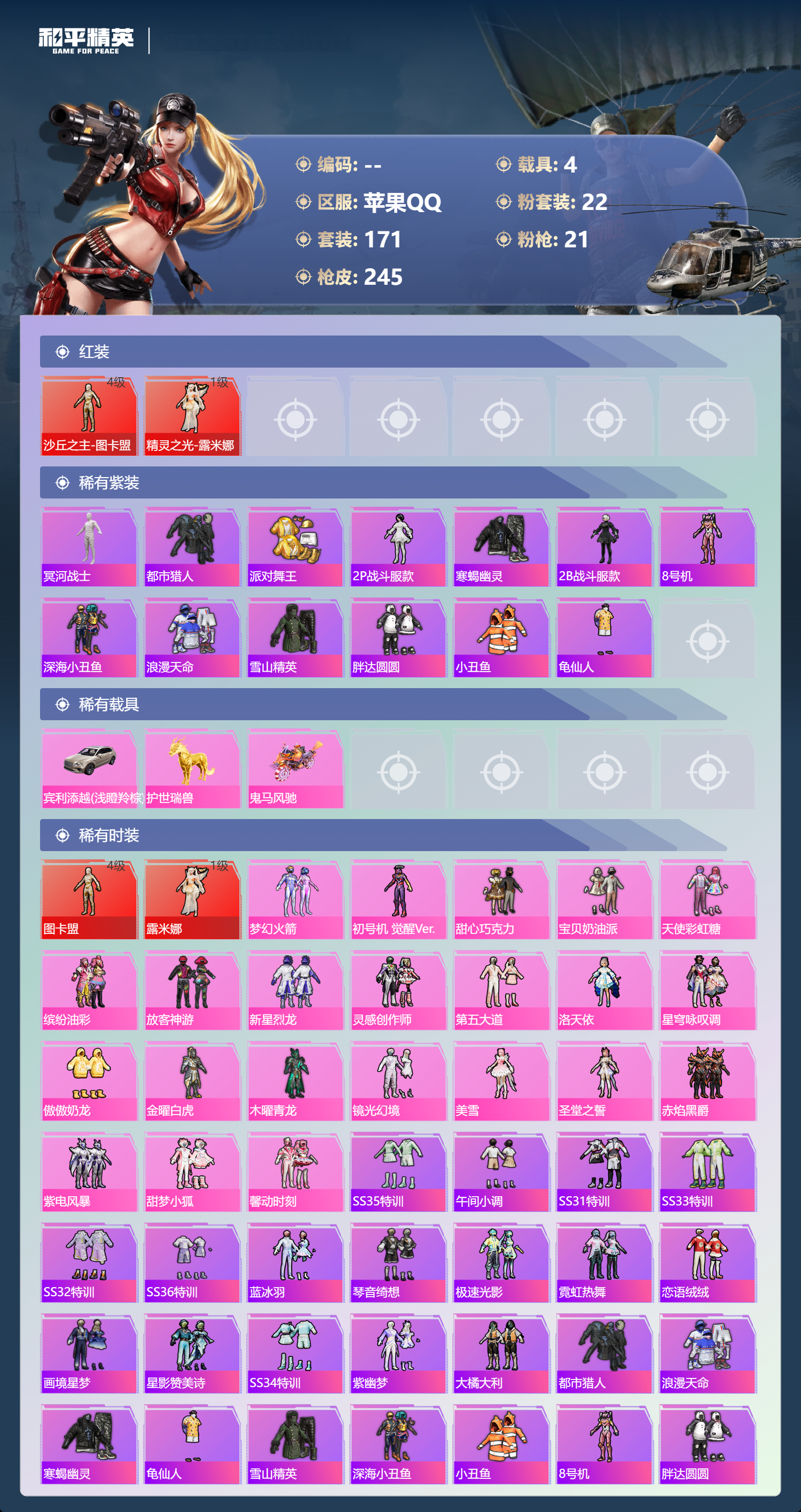 8王牌印记-2红装-22粉装-21特效枪-4载具