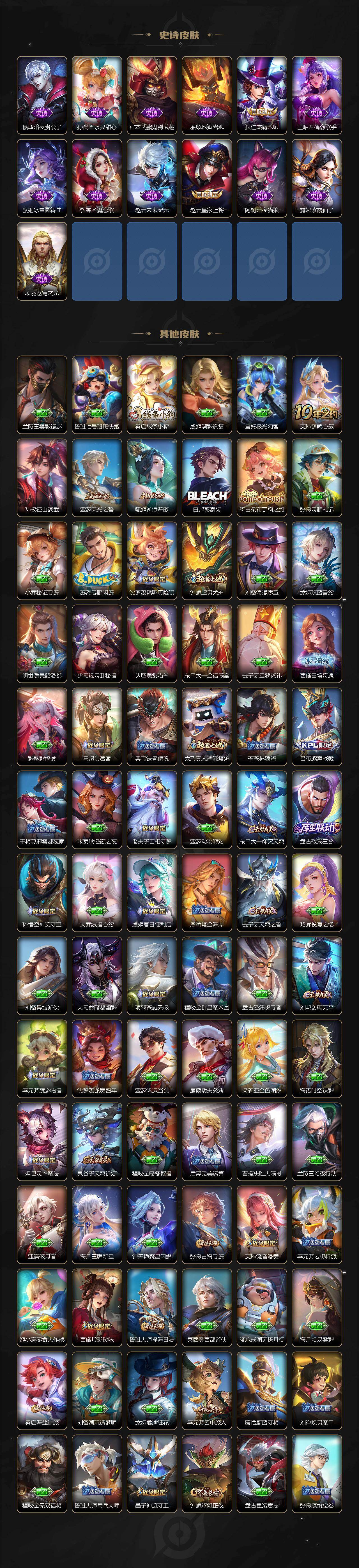 贵族等级8/荣耀典藏数量2/传说皮肤数量22/史诗皮肤数量95/皮肤数量370/英雄数量127/段位最强王者/孙权全皮/亚连全皮/司空震全皮/戈娅全皮/影全皮/大秦宣太后 芈月/九霄神辉 花木兰/器灵·螭龙剑 曜/时之奇旅 孙策/神树通天 后羿/愿照·山河定 司空震/幻光神枪 云缨/鸣野蒿 桑启/落雪白狼 亚连/逐花归海 澜/遇见神鼓 吕布/怒海麟威 吕布/碎云 百里守约/无双飞将 马超/末日