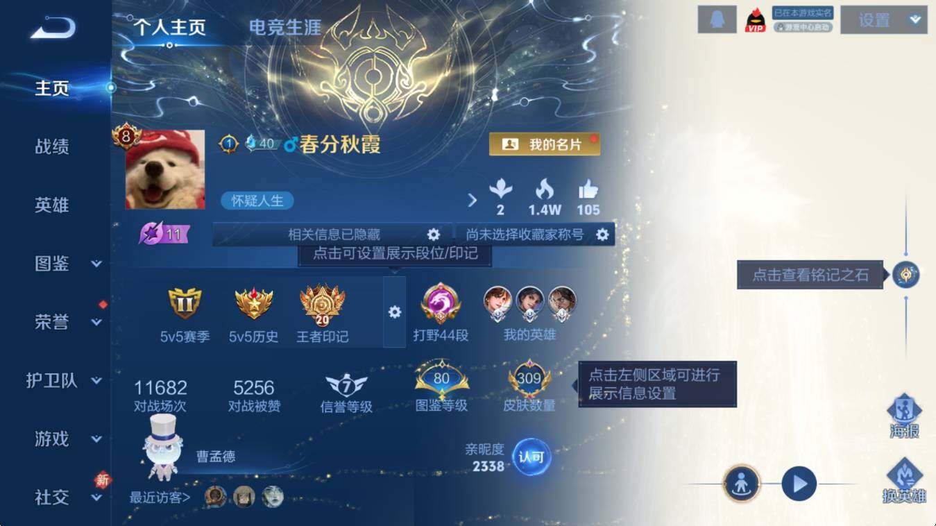 贵族等级8/荣耀典藏数量2/传说皮肤数量26/史诗皮肤数量85/皮肤数量309/英雄数量128/段位至尊星耀/司马懿全皮/孙权全皮/敖隐全皮/空空儿全皮/影全皮/鸣剑·曳影 李白/弑枪猎影 韩信/天机白泽 诸葛亮/器灵·螭龙剑 曜/群星魔术团 韩信/碎月剑心 李白/黑崎一护 宫本武藏/朽木白哉 暃/兔狲·蓬尾 张飞/江户川柯南 鲁班七号/怪盗基德 马可波罗/神树通天 后羿/千山共赴 干将莫邪/