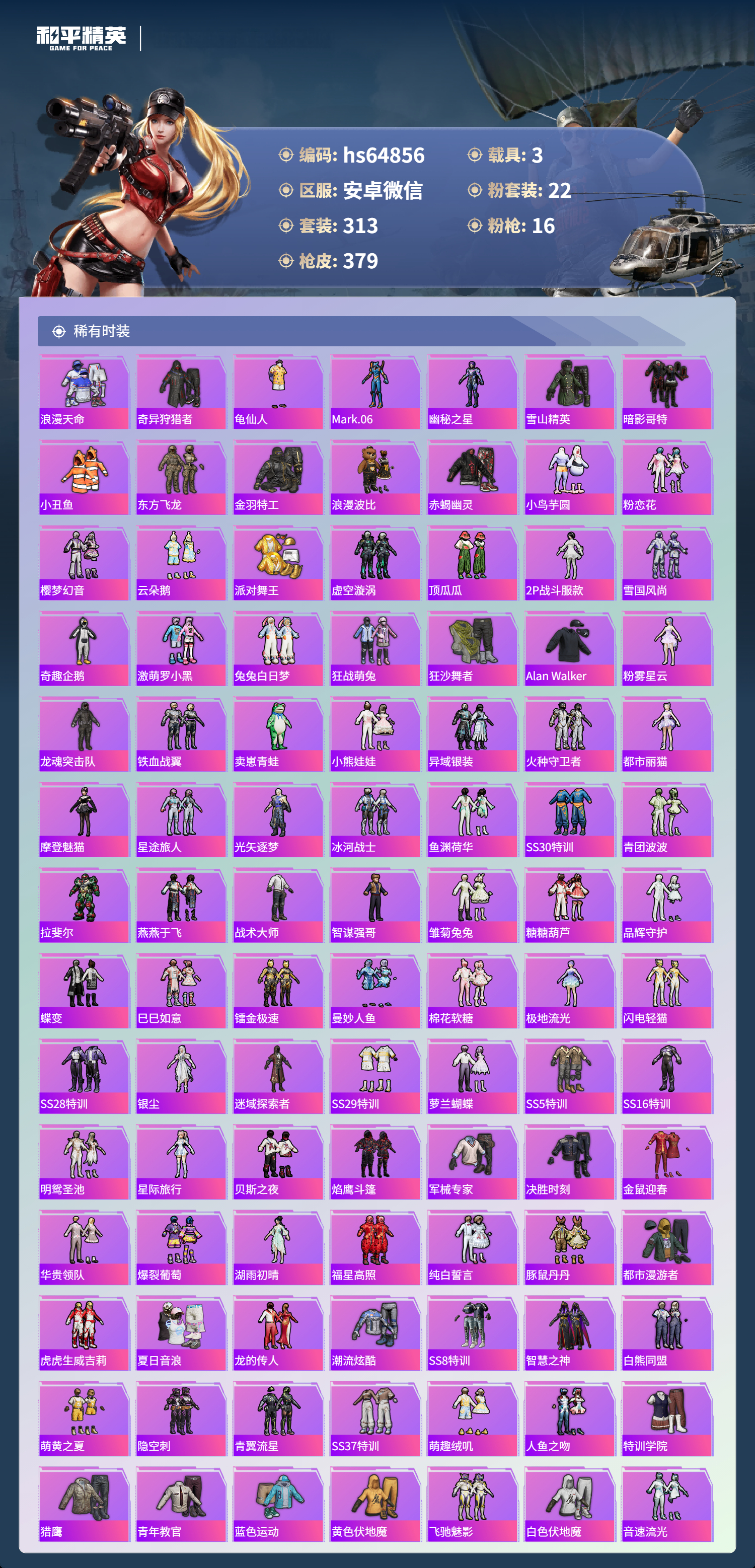 19王牌印记-2红装-22粉装-16特效枪-3载具-热力值-313套装