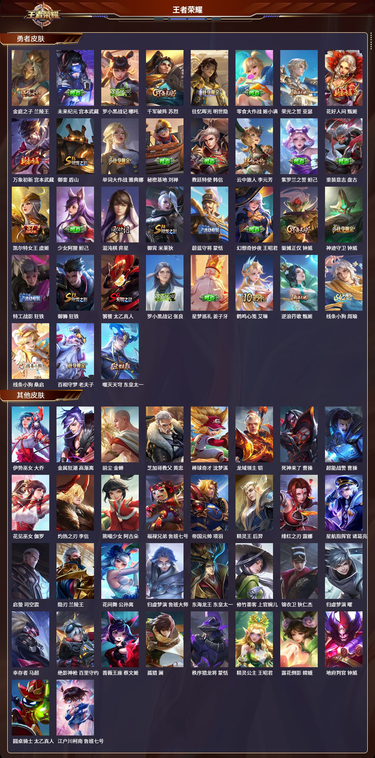 苹果QQ/非凡王者/207皮肤/127英雄/1典藏/0珍品无双/1无双/1珍品传说/8传说/59史诗/8稀有英雄【1 珍品传说】江户川柯南 鲁班七号,【1 典藏皮肤】神鉴启示录 虞姬,【1 无双皮肤】离恨烟 公孙离,【8 传说皮肤】神骥·赴朔漠 狄仁杰,神骥·聚万邦 貂蝉,地狱之眼 宫本武藏,霜月吟 露娜,黄金狮子座 达摩,异界灵契 孙尚香,绛天战甲 铠,神树通天 后羿,【59 史诗皮肤】紫霞仙子