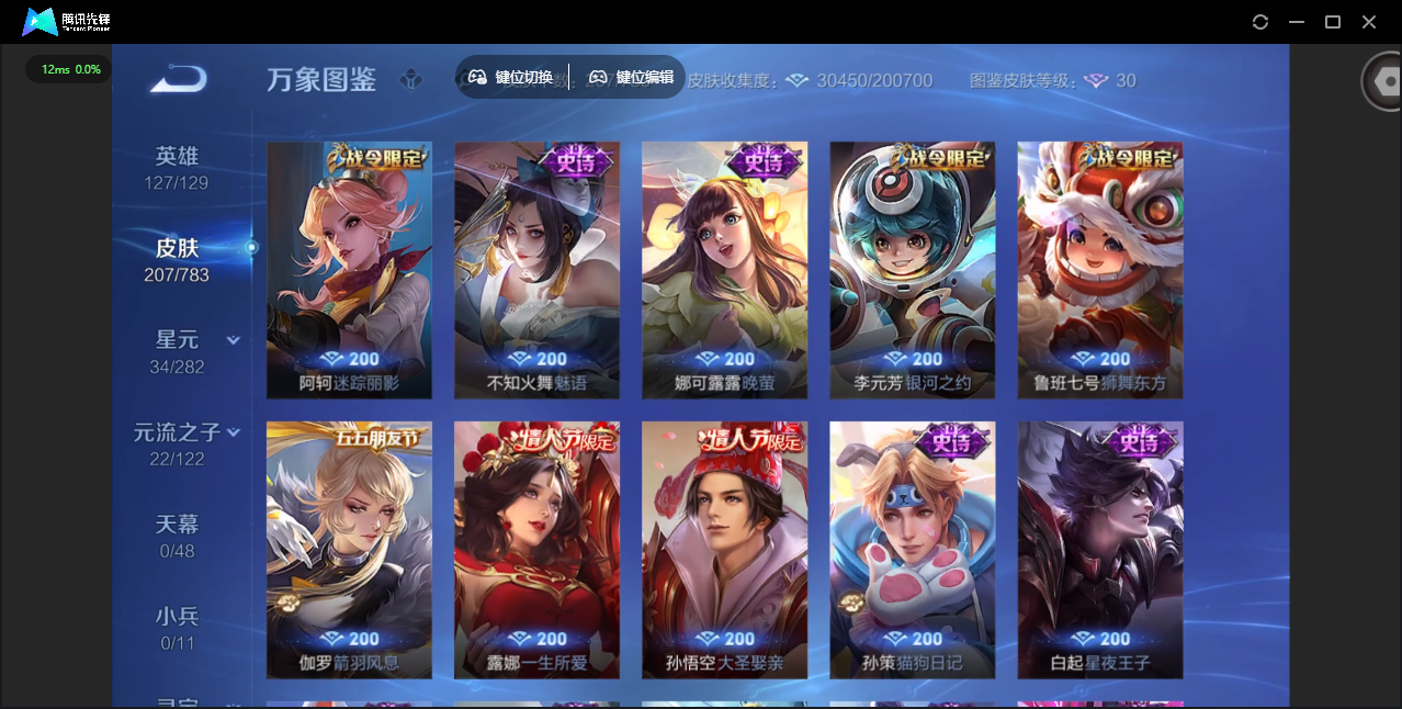 非凡王者/207皮肤/127英雄/1典藏/0珍品无双/1无双/1珍品传说/8传说/59史诗/8稀有英雄
