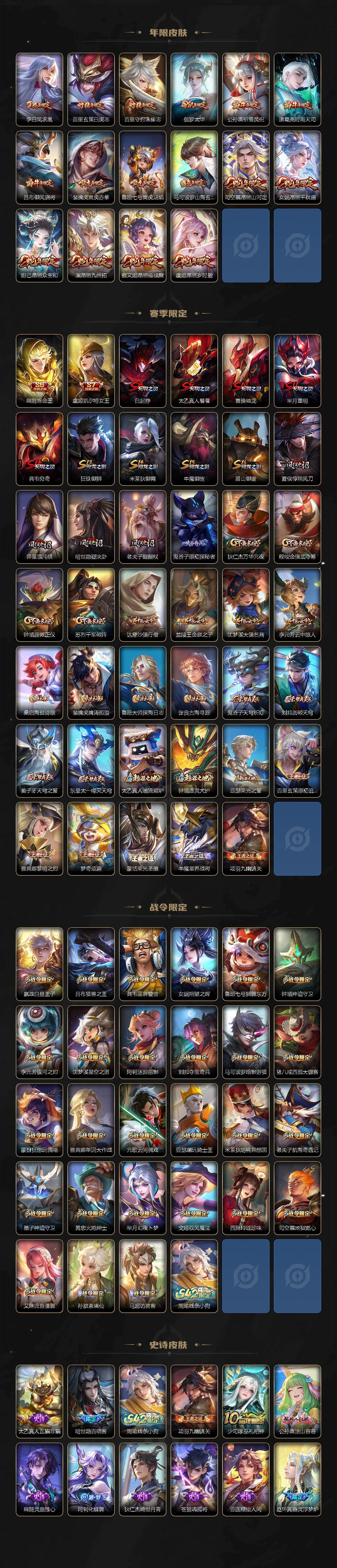 贵族等级10/荣耀典藏数量7/传说皮肤数量52/史诗皮肤数量123/皮肤数量429/英雄数量128/段位最强王者/孙权全皮/猪八戒全皮/司空震全皮/空空儿全皮/武则天/全息碎影 孙悟空/天鹅之梦 小乔/杀手不太冷 孙尚香/星空梦想 鲁班七号/鸣剑·曳影 李白/弑枪猎影 韩信/安琪拉颠倒童话魔镜/器灵·螭龙剑 曜/雪境奇遇 甄姬/时之魔女 小乔/碎月剑心 李白/真我赫兹 瑶/伽罗沧流箭/器灵·落