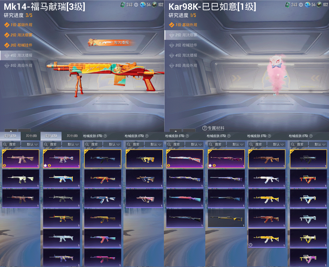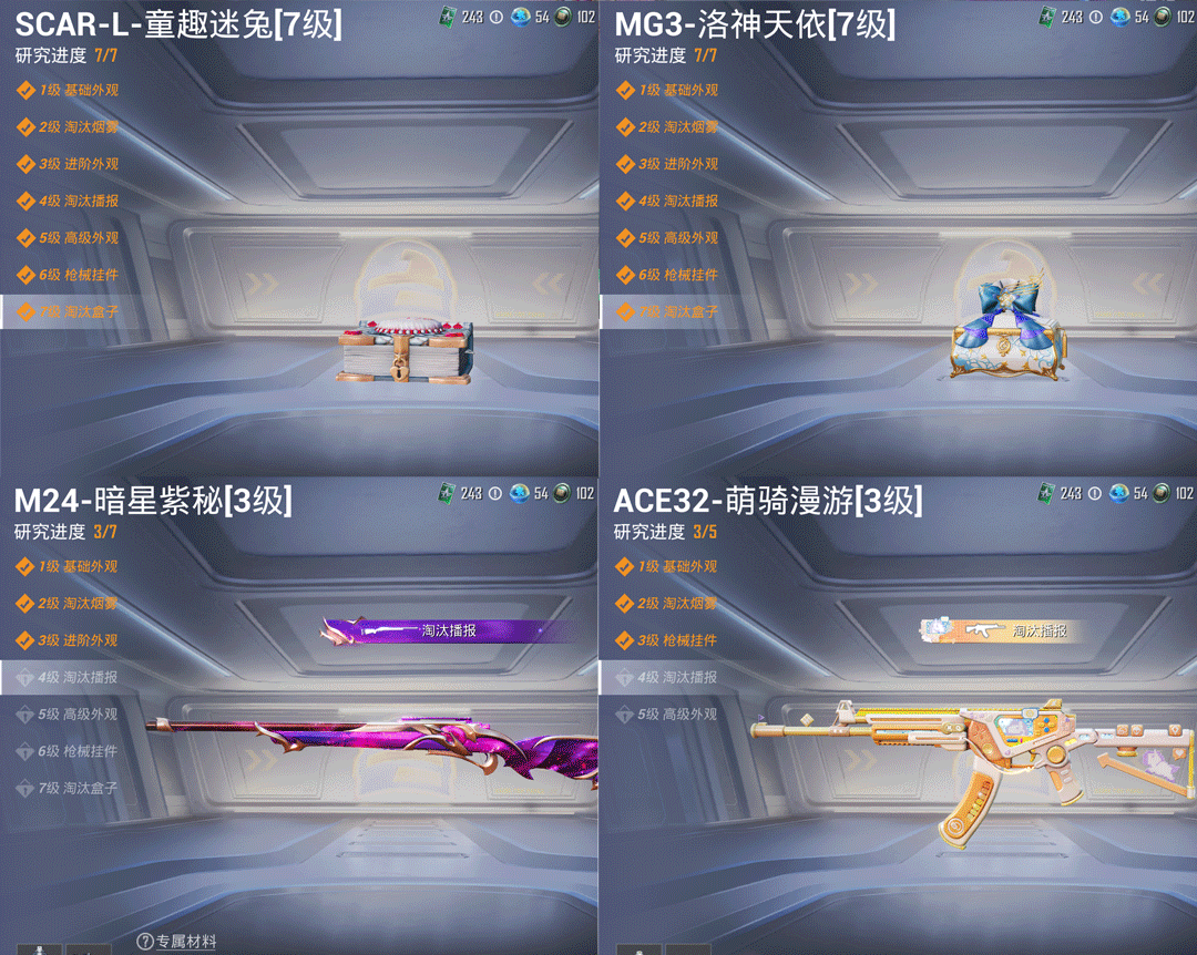 特效枪7:M416-心之恋语/7级,,SCAR-L-童趣迷兔/7级,,MG3-洛神天依/7级,,Mk14-福马献瑞/3级,ACE32-萌骑漫游/3级,,M24-暗星紫秘/3级,,Kar98K-巳巳如意/1级,