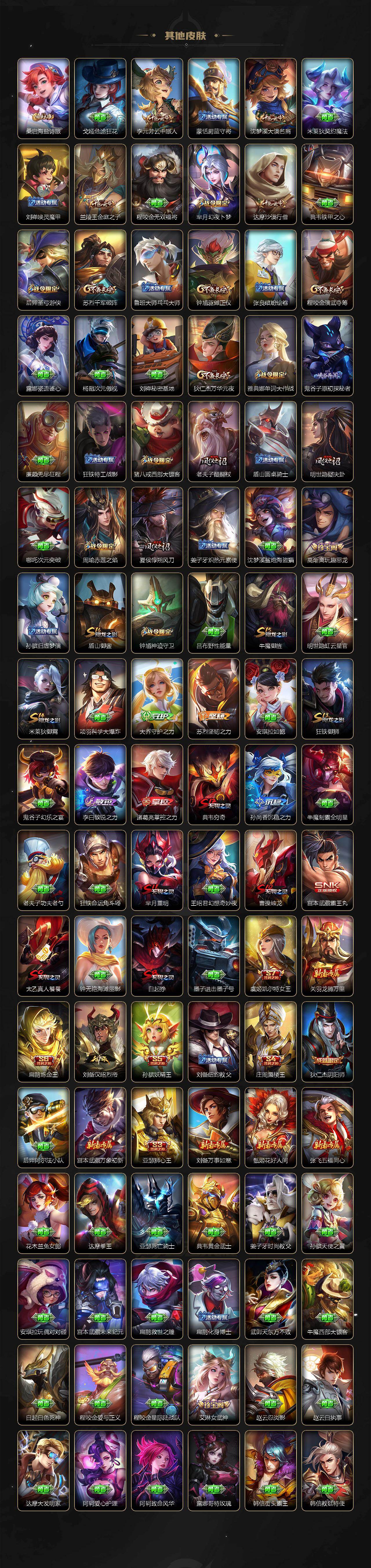 【传说皮肤】:云缨神骥越千峰,貂蝉神骥聚万邦,后羿神树通天,马超无双飞将,虞姬启明星使,干将莫邪久胜战神,虞姬云霓雀翎,百里玄策白虎志,后羿黄金射手座,貂蝉仲夏夜之梦,孙尚香末日机甲,宫本武藏地狱之眼【限定皮肤】:白起狰,姜子牙天穹之誓,狄仁杰阴阳师,虞姬凯尔特女王,赵云皇家上将,孙尚香蔷薇恋人,鲁班七号狮舞东方,庄周蜃楼王,庄周高山流水,高渐离玩趣恶龙,孙膑妖精王,扁鹊炼金王,芈月重明