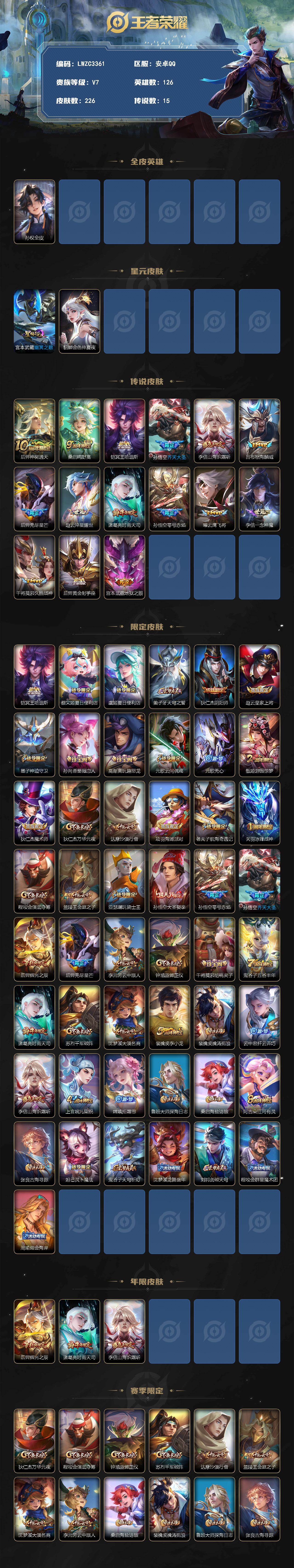 V7-最强王者段位-126英雄-226皮肤-15传说-59史诗-2星元 【英雄全皮】:孙权全皮 【传说皮肤】:后羿神树通天,桑启鸣野蒿,铠冥王哈迪斯,孙悟空齐天大圣,李信山海炽霜斩,吕布怒海麟威,后羿无尽星芒,赵云淬星耀世,诸葛亮时雨天司,孙悟空零号赤焰,曜云鹰飞将