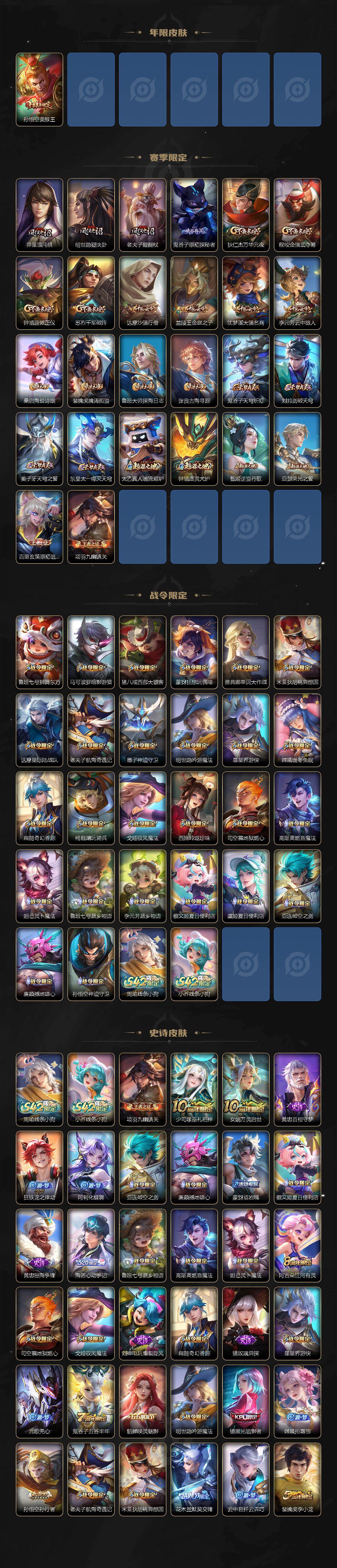 308皮肤-1典藏皮肤-10传说-84史诗 【英雄全皮】:戈娅全皮 【荣耀典藏】:孙悟空全息碎影 【传说皮肤】:后羿神树通天,桑启鸣野蒿,项羽无限倾心,孙悟空齐天大圣,兰陵王默契交锋,镜炽阳神光,孙悟空零号赤焰,干将莫邪久胜战神,貂蝉仲夏夜之梦,孙悟空地狱火