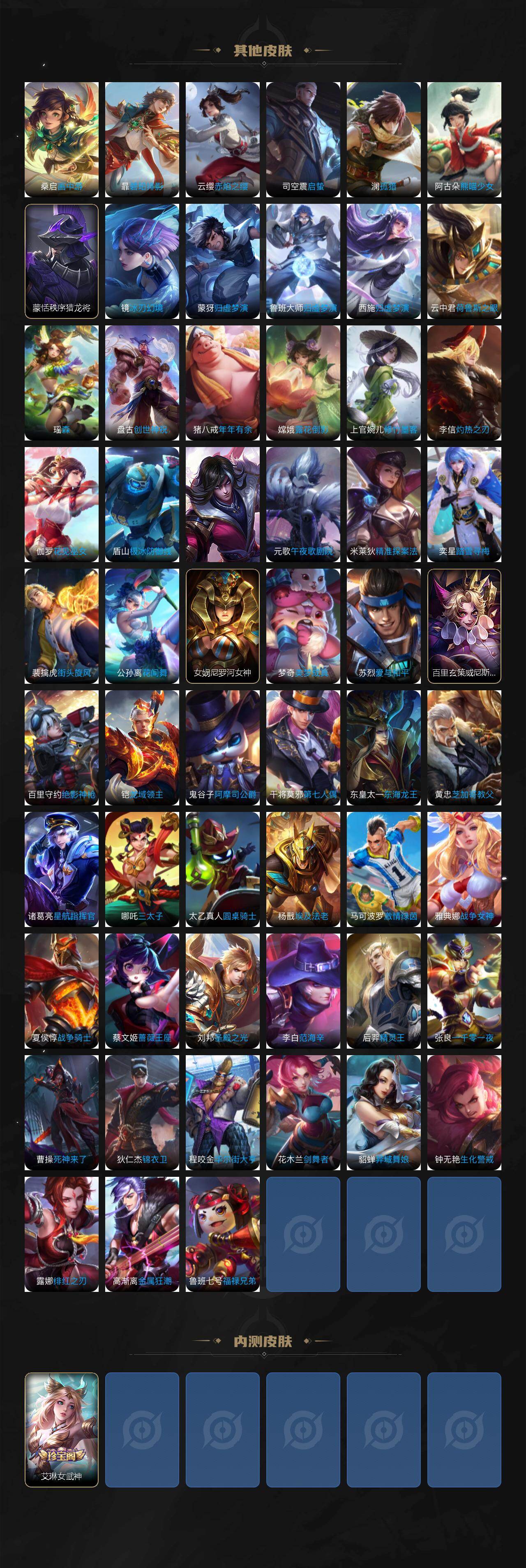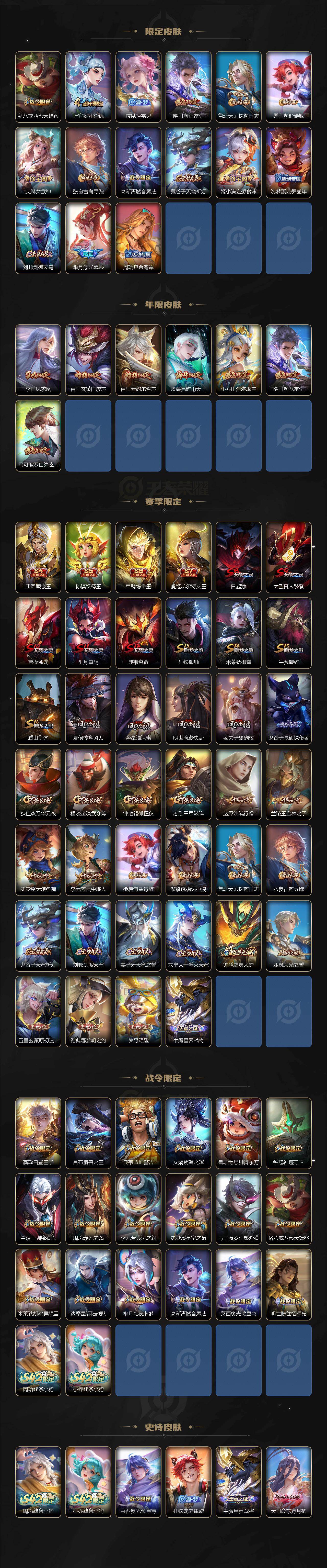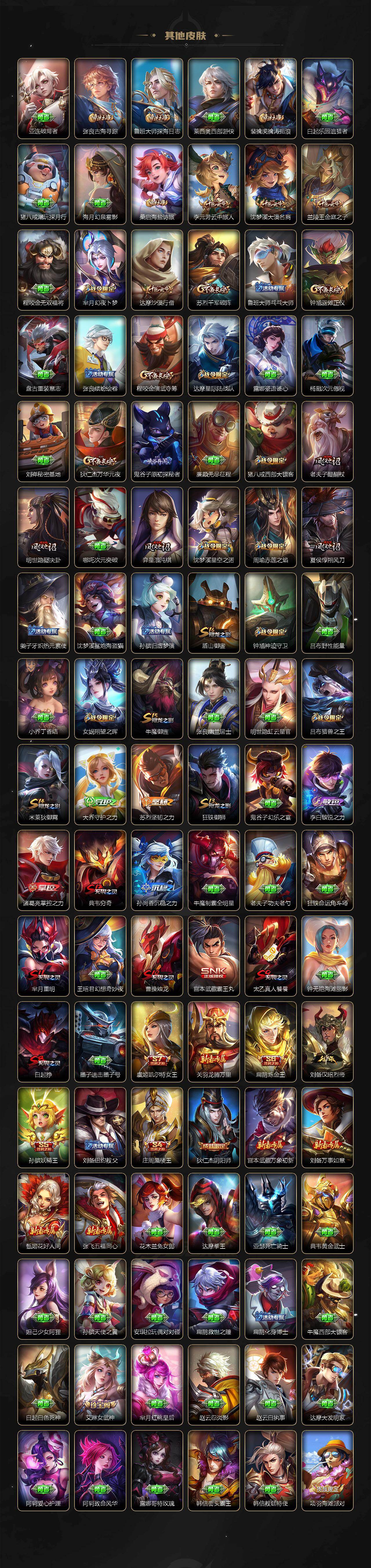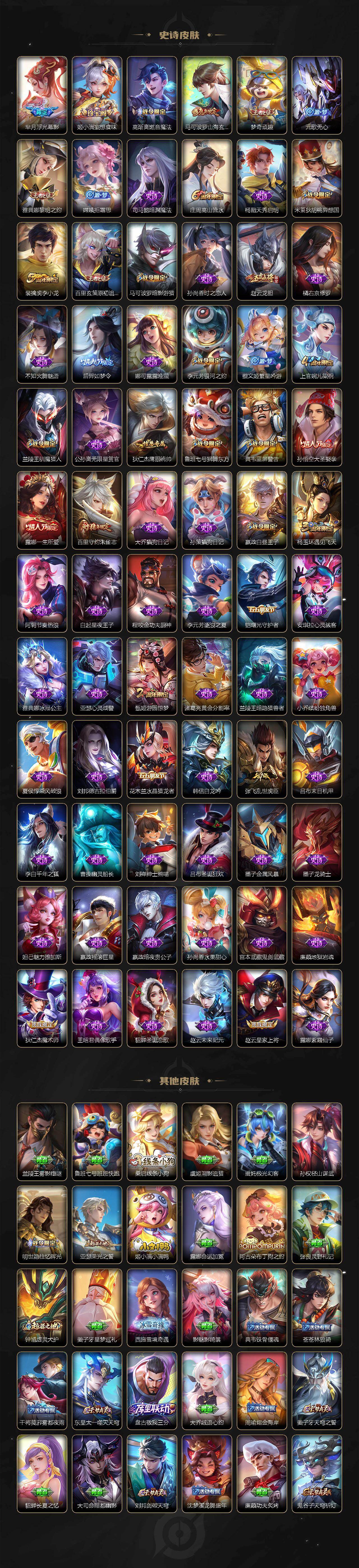 V8-287皮肤-1典藏皮肤-18传说-77史诗 【英雄全皮】:孙权全皮,敖隐全皮 【荣耀典藏】:韩信弑枪猎影 【传说皮肤】:云缨神骥越千峰,裴擒虎祥瑞亨通,桑启鸣野蒿,澜逐花归海,小乔山海琳琅生,曜山海苍雷引,王昭君乞巧织情,诸葛亮时雨天司,虞姬启明星使,曜云鹰飞将,貂蝉猫影幻舞,张良黄金