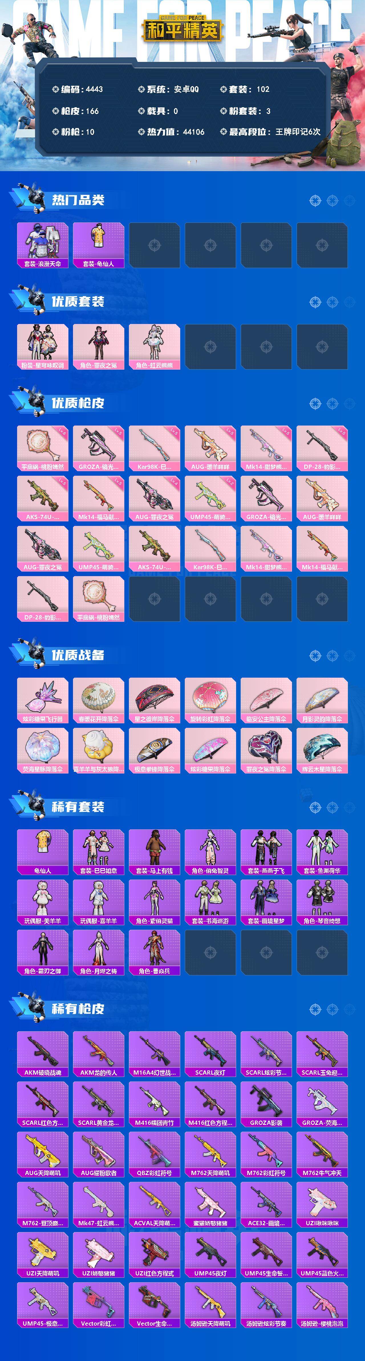 粉装3/粉枪10/珍稀飞行器/套装102/枪皮166/热力值44106/历史最高段位:王牌印记6次/Lv:59/五级GROZA-镜光银凌/五级AUG-暖羊咩咩/四级AUG-罪夜之冕/二级UMP45-萌骑冒险/五级AKS-74U-森灵之息/五级Kar98K-巳巳如意/五级Mk14-甜梦熊击/五级Mk14-福马献瑞/五级DP-28-豹影疾电/六级平底锅-桃粉嫣然/套装-浪漫天命/套装-