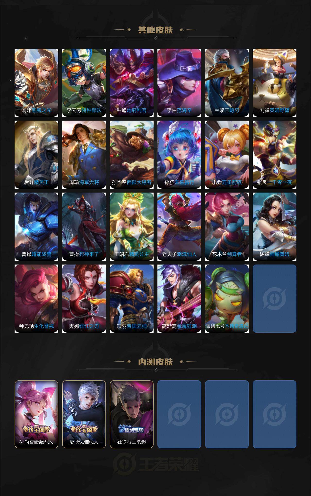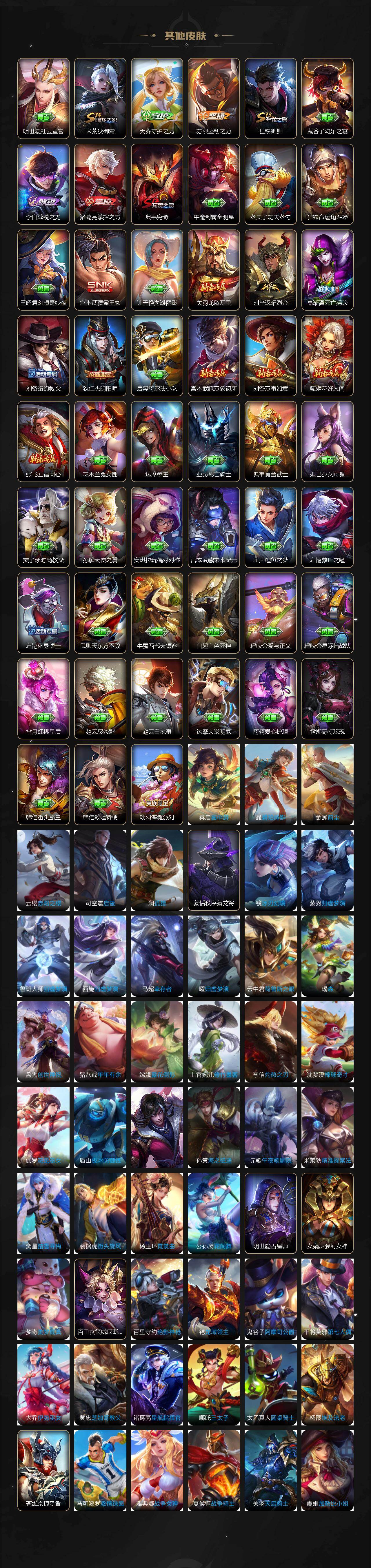 【传说皮肤】:云缨神骥越千峰,杨戬纵目迁山,曹操万灵伏威,司空震愿照山河定,澜愿照九州拓,亚连落雪白狼,赵云乘龙铭钟鼎,澜逐花归海,曜山海苍雷引,吕布怒海麟威,李白诗剑行,裴擒虎寅虎赤拳,赵云淬星耀世,曜李逍遥 ,诸葛亮