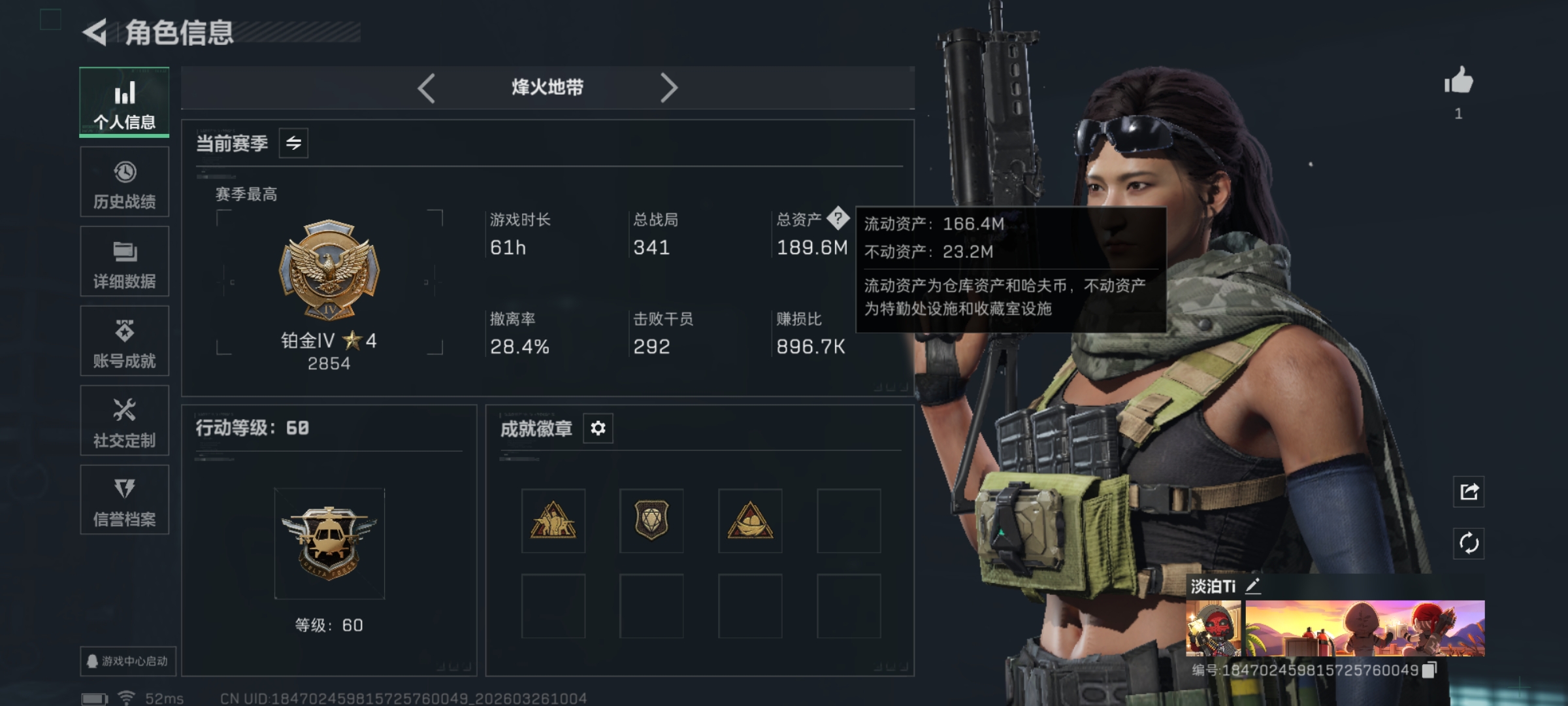 行动等级60级,7体7负重,绿色无违规,仓库有非洲之星复苏呼吸机,炫彩威小龙登大红,高爆率账号。