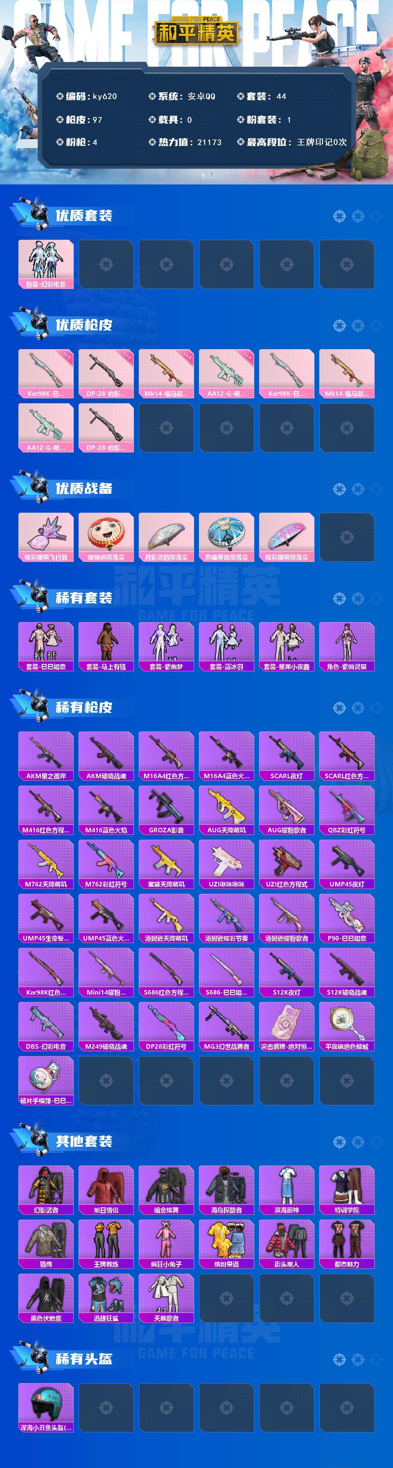 安卓 手Q-1粉装-4特效枪-0载具-1粉色飞行器-21173热力值-0王牌印记-44套装-97枪皮