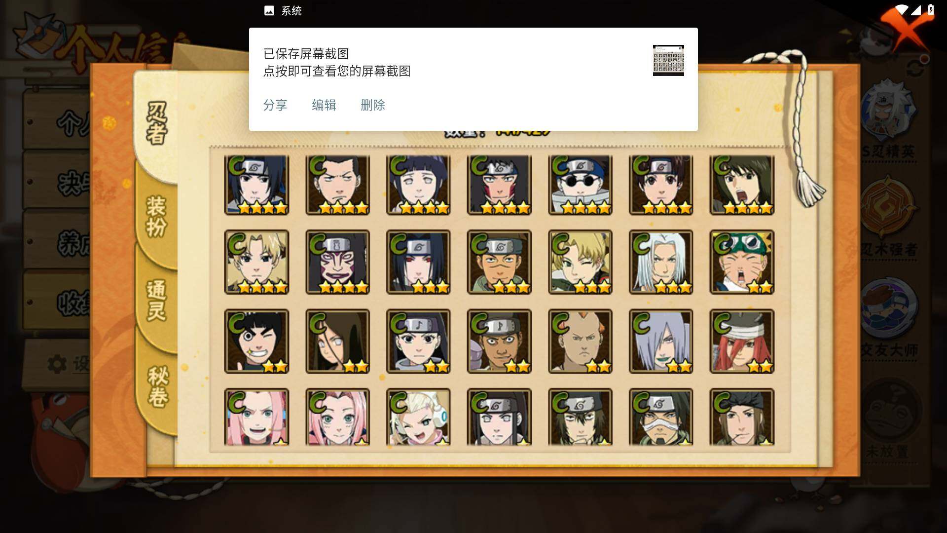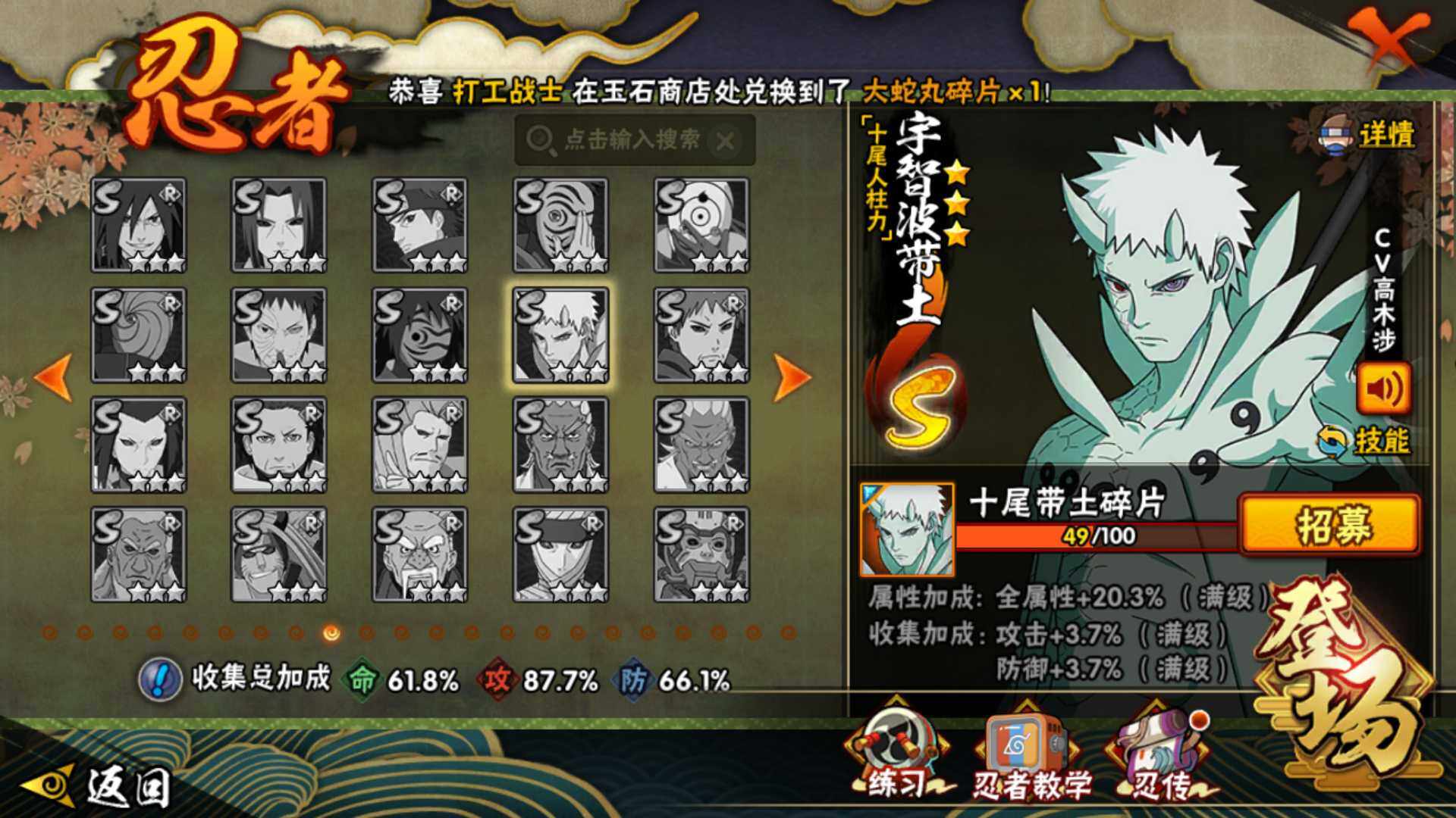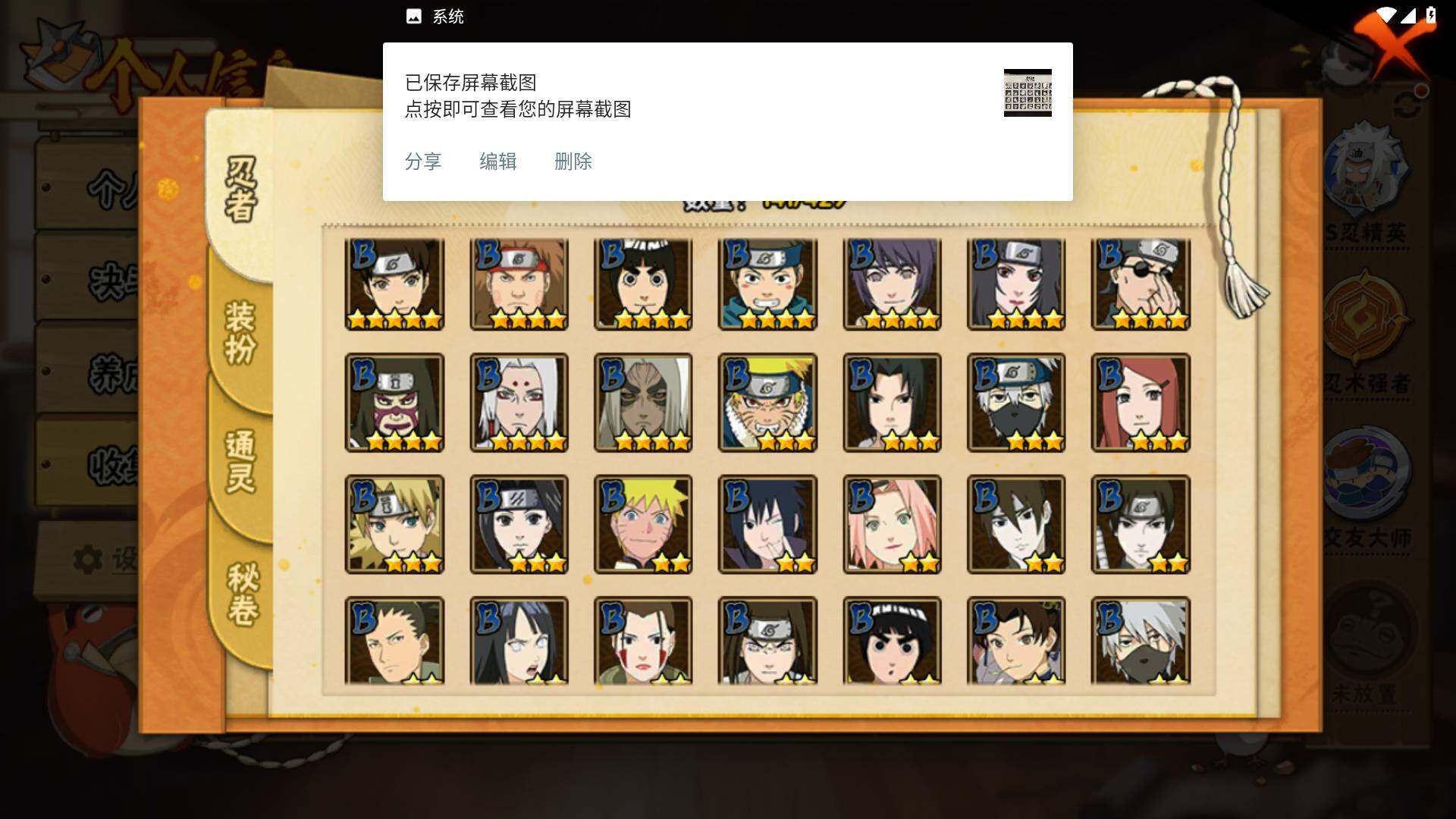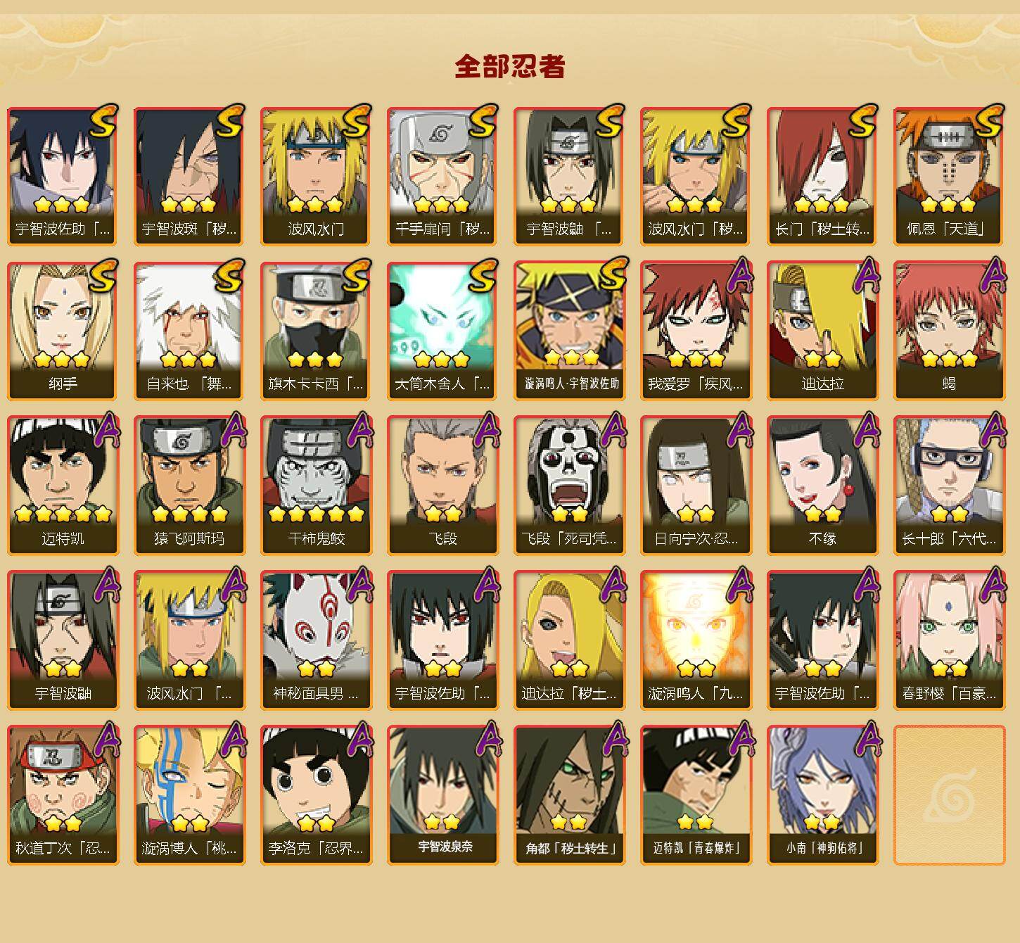 【S级忍者】:长门「秽土转生」(3星),波风水门「秽土转生」(3星),千手扉间「秽土转生」(3星),宇智波斑「秽土转生·解」(3星),宇智波鼬「须佐能乎」(3星),旗木卡卡西「须佐能乎」(3星),自来也「舞之豪杰」(3星),纲手(3星),波风水门(3星),佩恩「天道」(3星),宇智波佐助「永恒万花筒」(3星),大筒木舍人