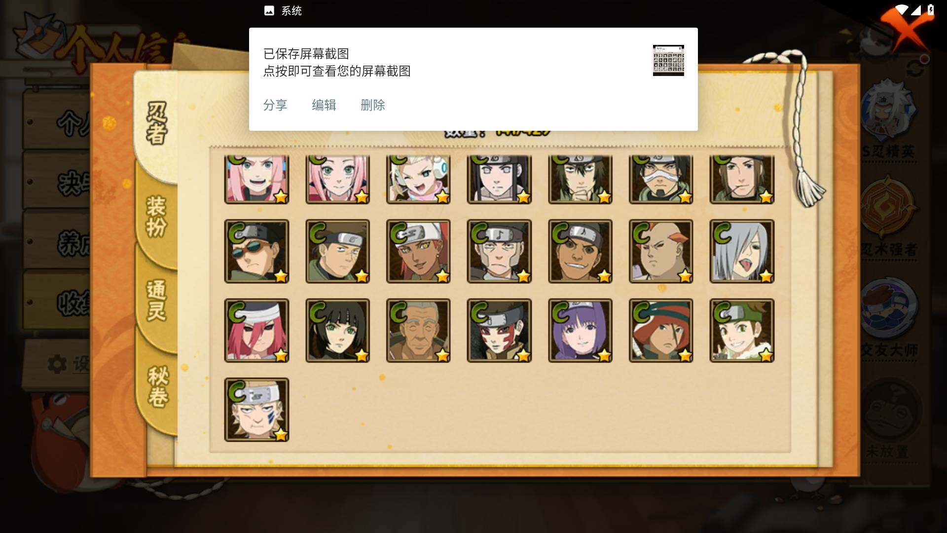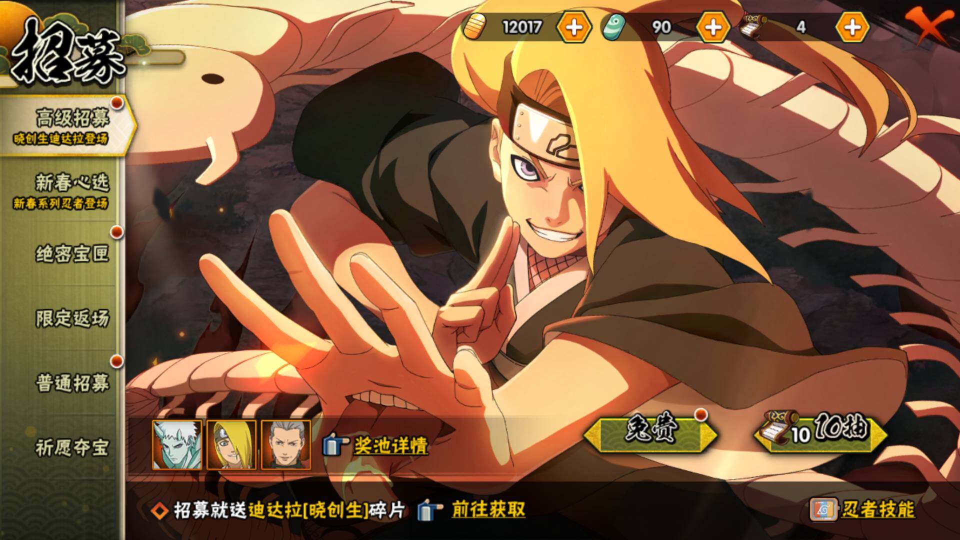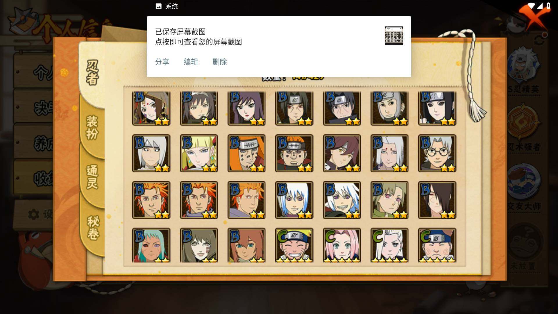 【S级忍者】:长门「秽土转生」(3星),波风水门「秽土转生」(3星),千手扉间「秽土转生」(3星),宇智波斑「秽土转生·解」(3星),宇智波鼬「须佐能乎」(3星),旗木卡卡西「须佐能乎」(3星),自来也「舞之豪杰」(3星),纲手(3星),波风水门(3星),佩恩「天道」(3星),宇智波佐助「永恒万花筒」(3星),大筒木舍人