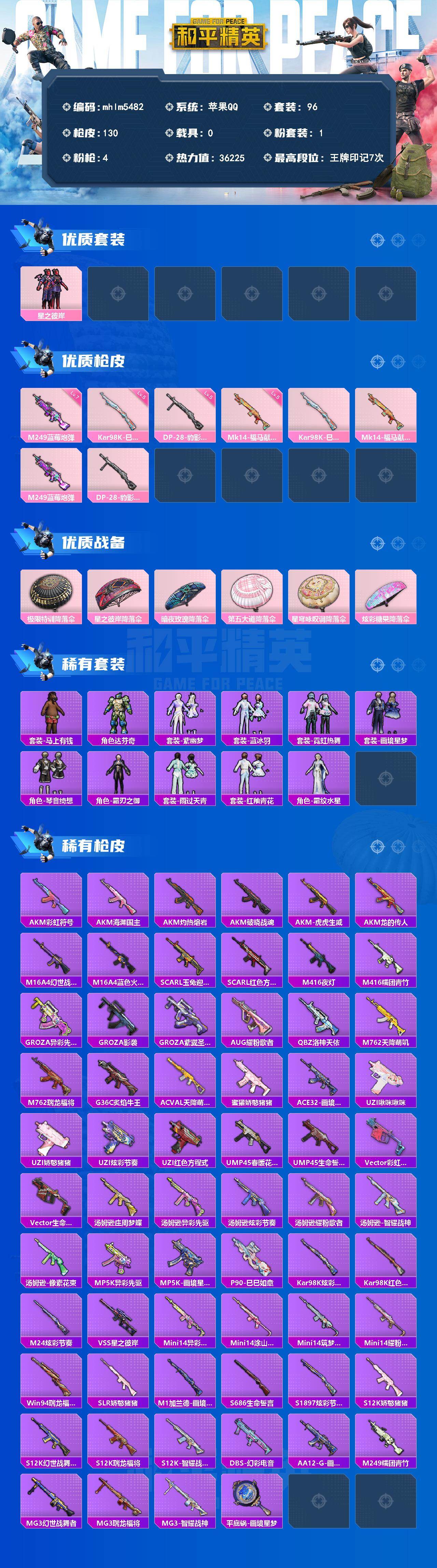 【mhlm5482】苹果 手Q-1粉装-4特效枪-0载具-0粉色飞行器-36225热力值-7王牌印记-96套装-130枪皮