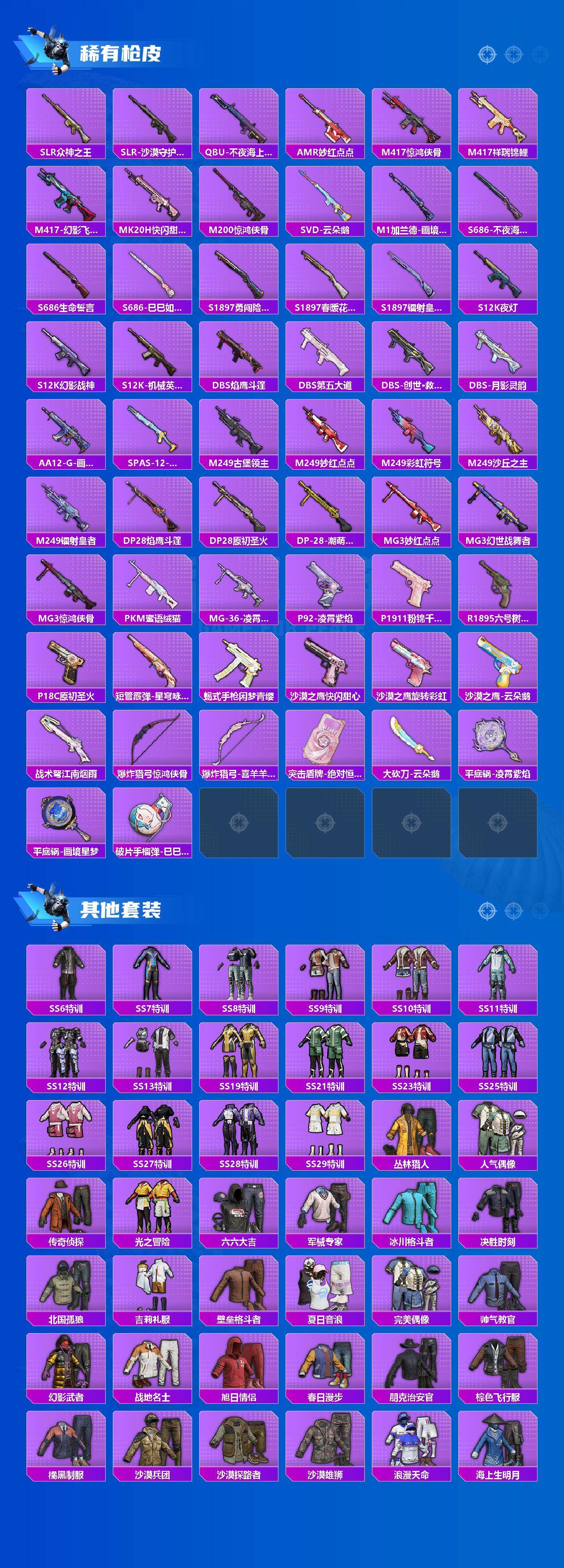 粉装13/粉枪8/珍稀飞行器130245,72239,72313,114177/套装246/枪皮289/热力值92538/历史最高段位:王牌印记10次/Lv:66/五级AKM-绿萝繁花/五级SCAR-L-锦绣绵绵/七级M416-心之恋语/五级AUG-暖羊咩咩/五级AKS-74U-森灵之息/五级Kar98K-巳巳如意/五级Mk14-福马献瑞/五级DP-28-豹影疾电/粉装-繁龙极客/套装-浪漫天命/小丑鱼/奇异狩猎者/金羽特工/旭日初心兜帽大衣/套装-龟仙人/套装-潮萌小黄鸭/套装-浪漫波比/套装