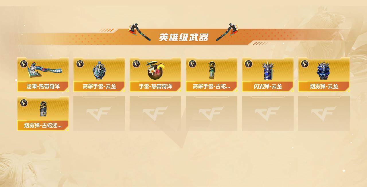 【热门武器】:传说辉光,QBZ03-金色蔷薇*2,M200-幻神,金色蔷薇-古蛇迷踪,修罗-古蛇迷踪,M200-竞技荣光,MK5-炽火炎龙,羊驼玩偶,炽芒蝶刃*2,炽芒蝶刃-破浪逐光 皮肤*2