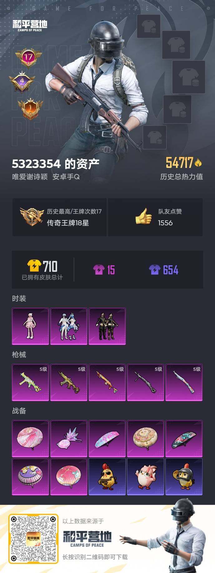 安卓 手Q-3粉装-5特效枪-0载具-1粉色飞行器-54717热力值-17王牌印记-162套装-196枪皮