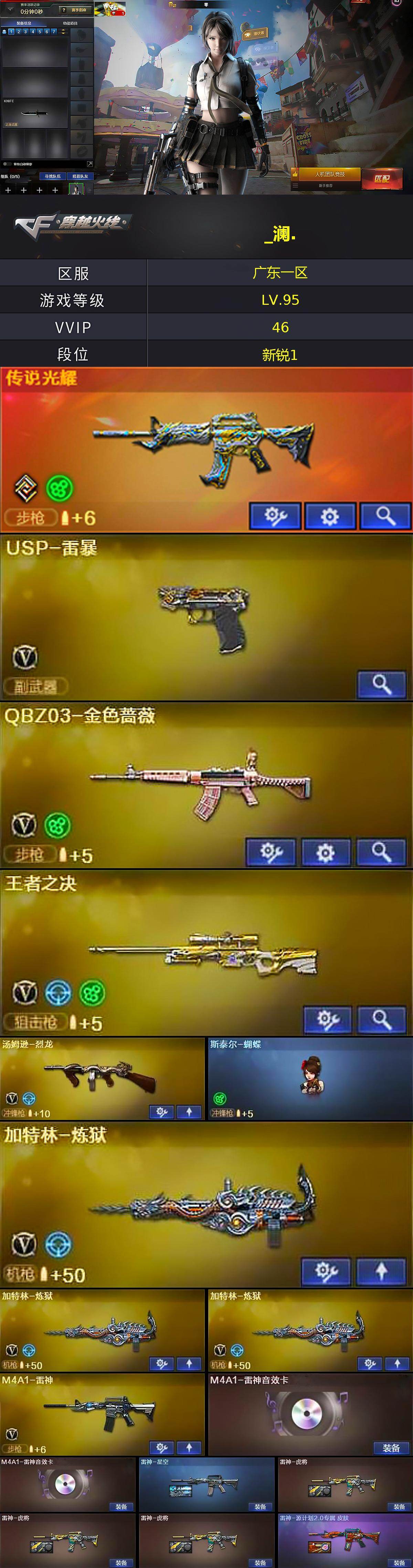 【热门武器】:传说光耀,QBZ03-金色蔷薇,HK417-朱雀,死亡之眼*3,毒蜂,M4A1-黑骑士,汤姆逊-烈龙,加特林-炼狱*3,斯泰尔-蝴蝶,COP-白鲨,USP-雷暴,沙鹰-修罗*2