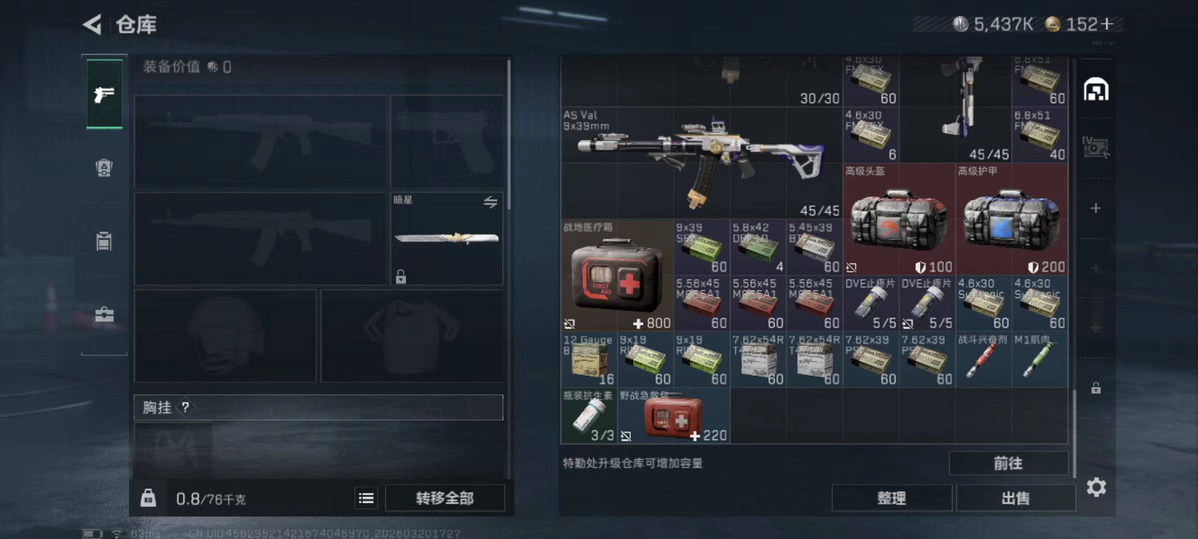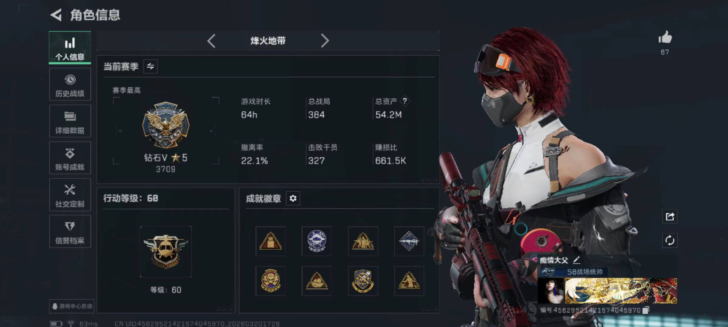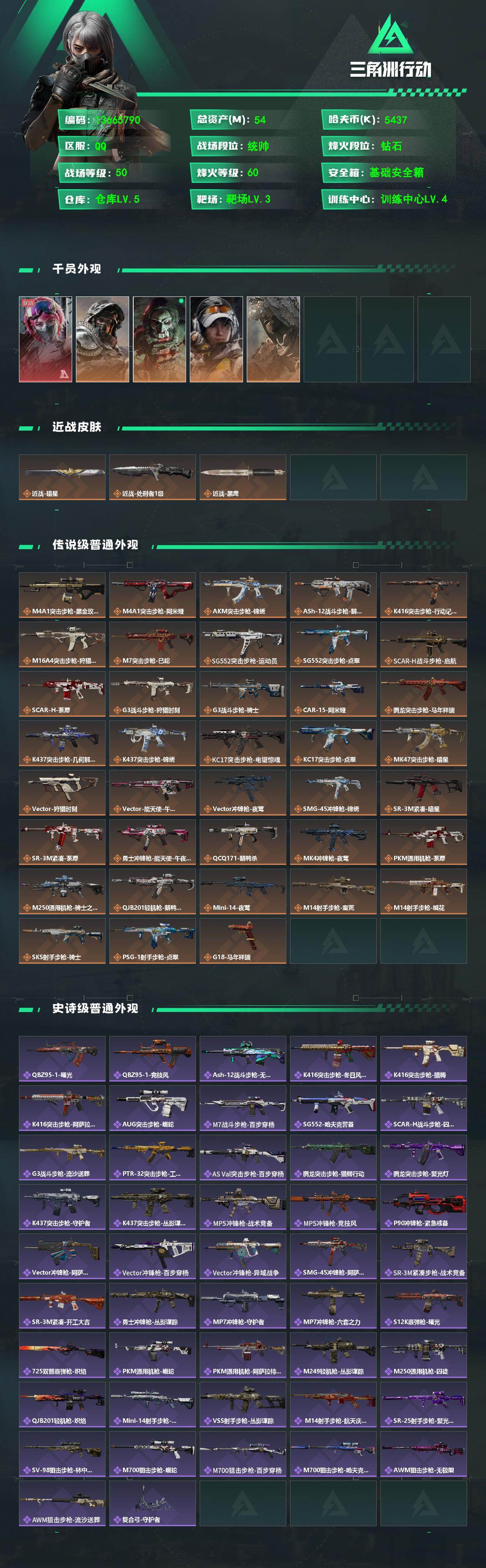 总资产(M):54M/哈夫币(K):5437K/哈夫币(K):5437K/传说枪皮数:38/全面战场等级:50_段位:统帅/烽火地带等级:60_段位:钻石/蛊-能天使午夜邮差/深蓝-不破誓约/红狼-电锯惊魂/露娜-金牌射手/乌鲁鲁-荒原猎手/近战-暗星/近战-处刑者1级/近战-黑鹰/M4A1突击步枪-蚀金玫瑰/M4A1突击步枪-阿米娅/AKM突击步枪-锦绣/ASh-12战斗步枪-鹅鸭杀/K416