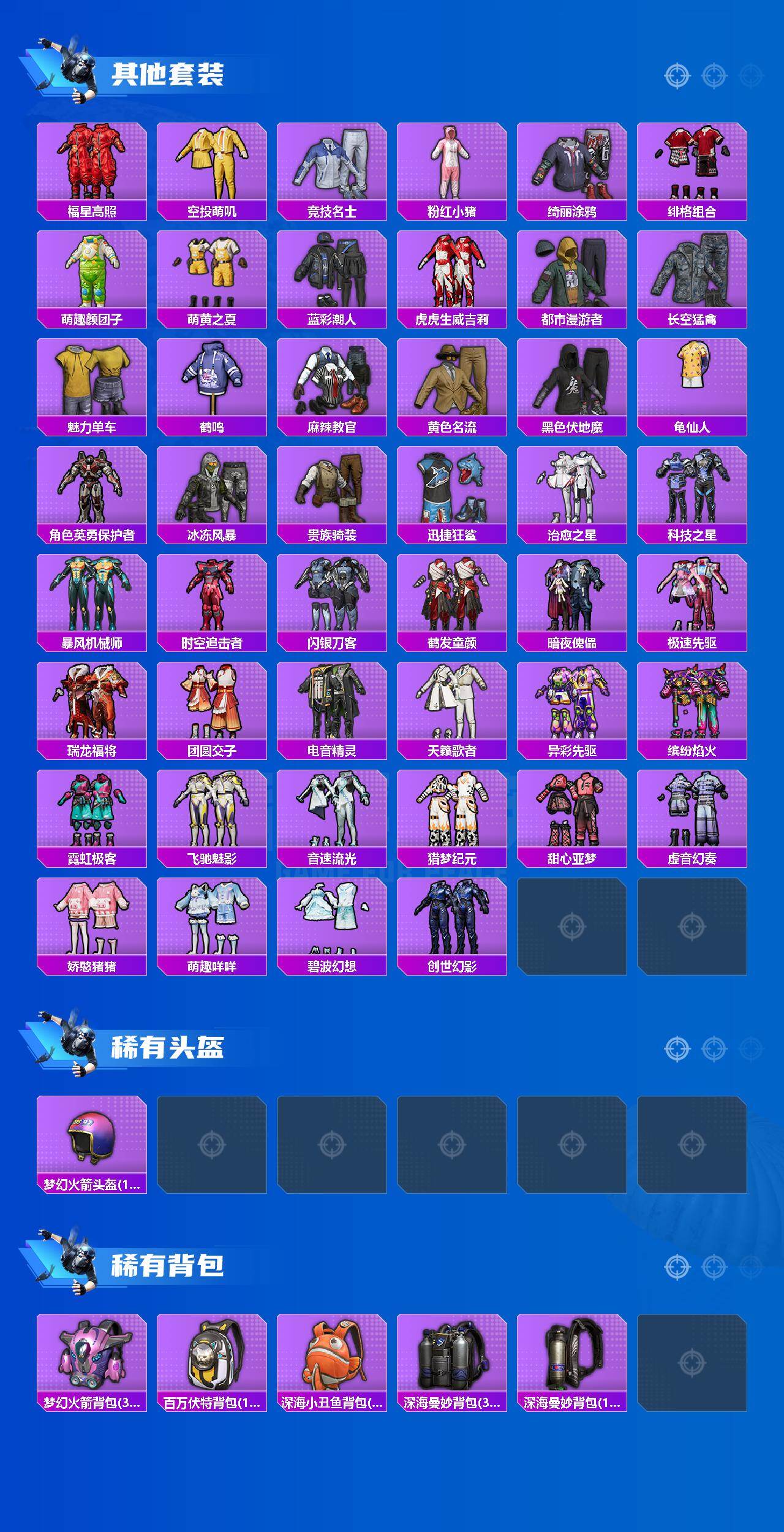 粉装5/粉枪6/载具1/套装126/枪皮185/热力值60057/历史最高段位:王牌印记2次/Lv:61/七级SCAR-L-青春物语/七级UZI-筑梦精灵/五级Kar98K-巳巳如意/四级Mk14-福马献瑞/五级DP-28-豹影疾电/五级MG3-洛神天依/军刀雅典娜/套装-龟仙人/套装-暗影哥特/套装-粉红小猪/暗夜玫瑰/洛天依/月影灵韵/萨利娅/角色-虎痴许褚/阿斯顿·马丁DBS(红)/SC