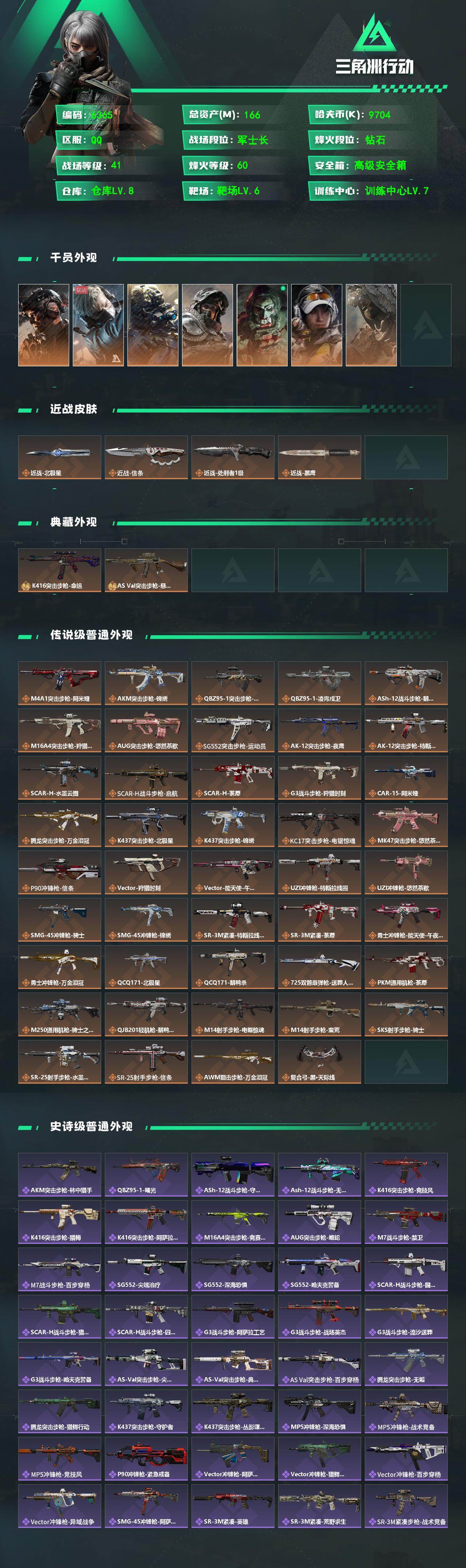 总资产166M/哈夫币970万/传说近战数1/传说枪皮数46/战场等级41/行动等级60/安全箱等时效性道具以游戏内数据为准,详情请看图/藏品-海洋之泪/威龙-铁面判官/蜂医-送葬人·无题密令/无名-夜鹰/深蓝-不破誓约/红狼-电锯惊魂/露娜-金牌射手/乌鲁鲁-荒原猎手/近战-北极星/近战-信条/近战-处刑者/近战-黑鹰/K416突击步枪-命运/AS Val突击步枪-悬赏令/K416突击步枪-