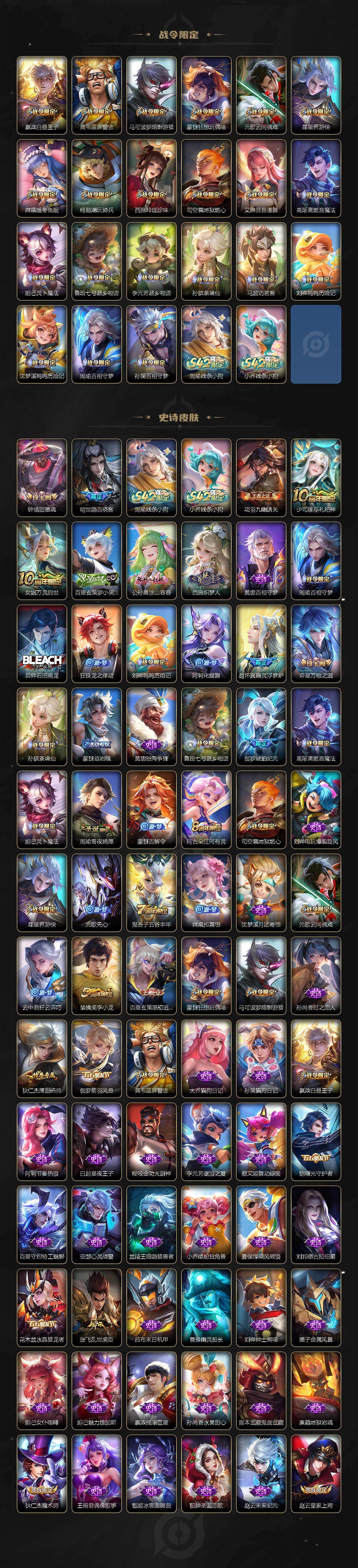 贵族6/皮肤285/典藏1/传说10/史诗76/英雄128/孙权全皮/敖隐全皮/