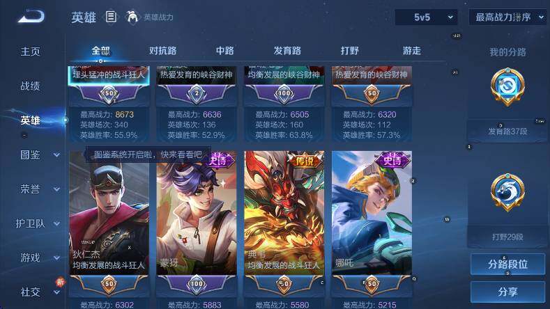 贵族7/皮肤227/典藏1/传说10/史诗57/英雄128/孙权全皮/敖隐全皮/